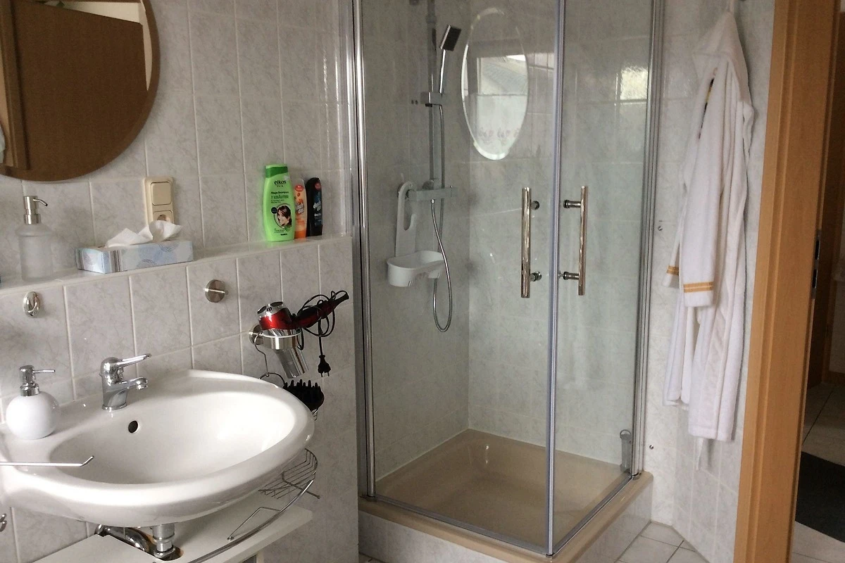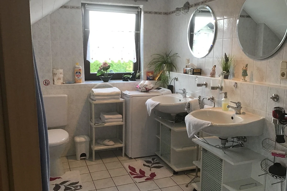 Im grossen, modernen Badezimmer finden Sie Dusche, WC und Waschmaschine gegen Gebühr