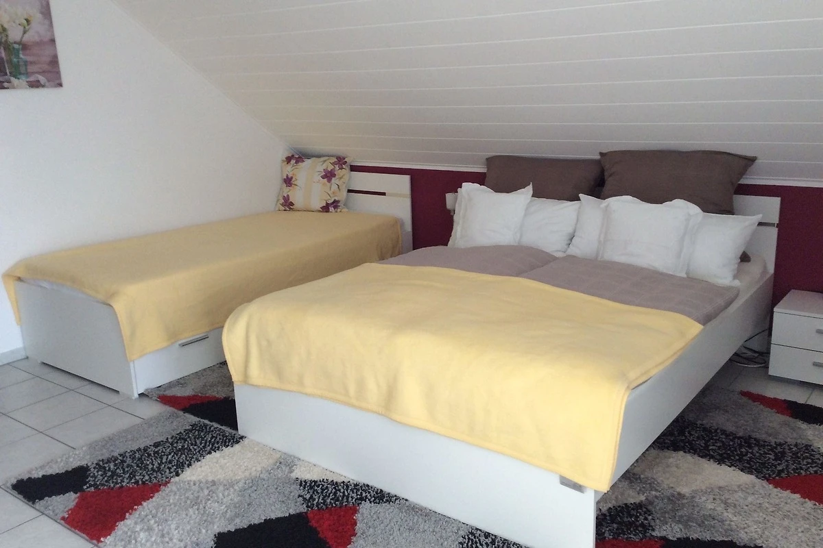 Weiteres bietet Ihnen die Wohnung ein separates Schlafzimmer. Dort finden Sie ein Doppelbett und ein Einzelbett.