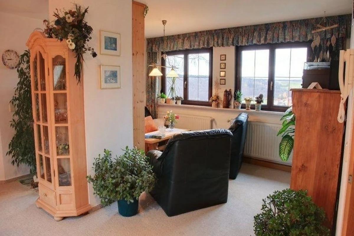 Wir begrüssen Sie mit einem kleinen Gastgeschenk in unserer 75 qm grossen Ferienwohnung Panorama, die mit 5 Sternen zertifiziert ist. Sie befindet sichim Dachgeschoss des Hauses mit einem herrlichen Panoramablicküber den Ort, weit in die Landschaft und ist gemütlich und modern eingerichtet. Sie verfügt über ein Wohn- und Aufenthaltsraum mit Küchenzeile, ein Schlafzimmer mit Doppelbett, ein kleines Schlafzimmer mit 2 Einzelbetten und einem Badezimmer.