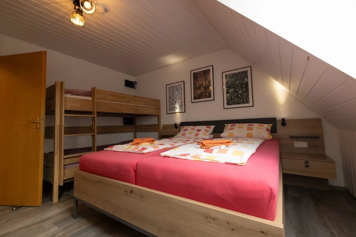 Über den Trippel und eine weitere Treppe kommen Sie in die neu renovierte Ferienwohnung Sternenhimmel im Dachgeschoss. Sie bietet Platz für 2-7 Personen mit hellen und grosszügig geschnittene Räumen unter dem typisch weit herunterragenden Schwarzwälder Walmdach.