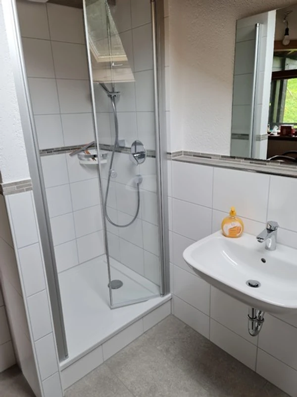 Ein Badezimmer mit Dachschräge ist mit einem Vollbad, Waschbecken und WC versehen. Das 2. Badezimmer ist mit Dusche, Waschbecken und WC.