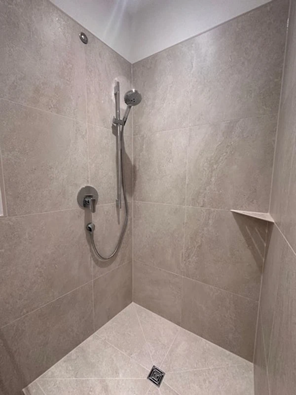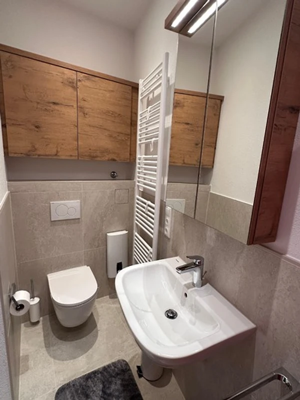 Das Badezimmer ist mit einer Dusche, WC und Waschbecken versehen.
