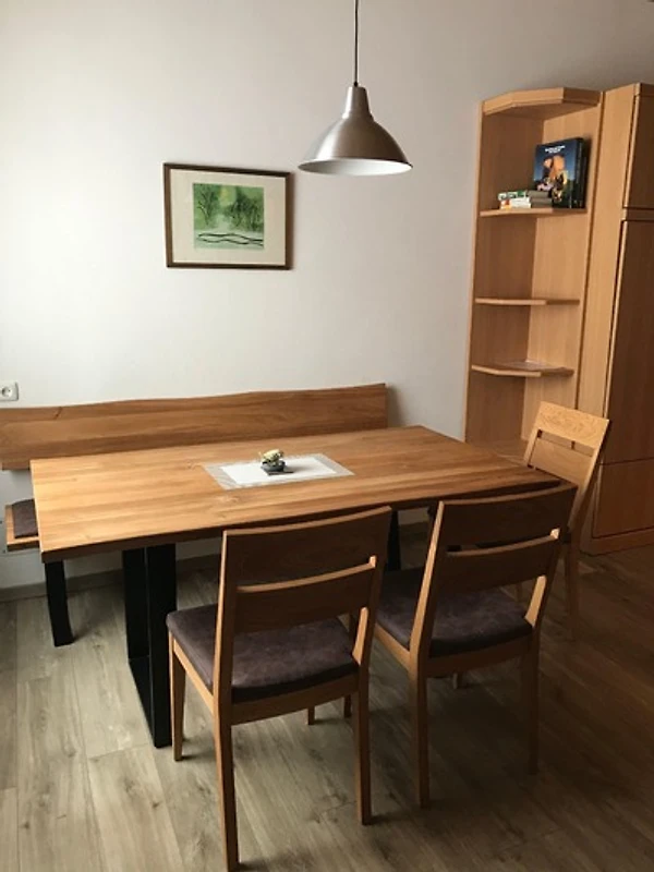 Die Ferienwohnung ist sehr rustikal gestaltet. Sie bietet Ihnen einen gemütlichen Wohnbereich mit einer bequemen Couchgarnitur für entspannte Abendstunden vor dem Fernseher.