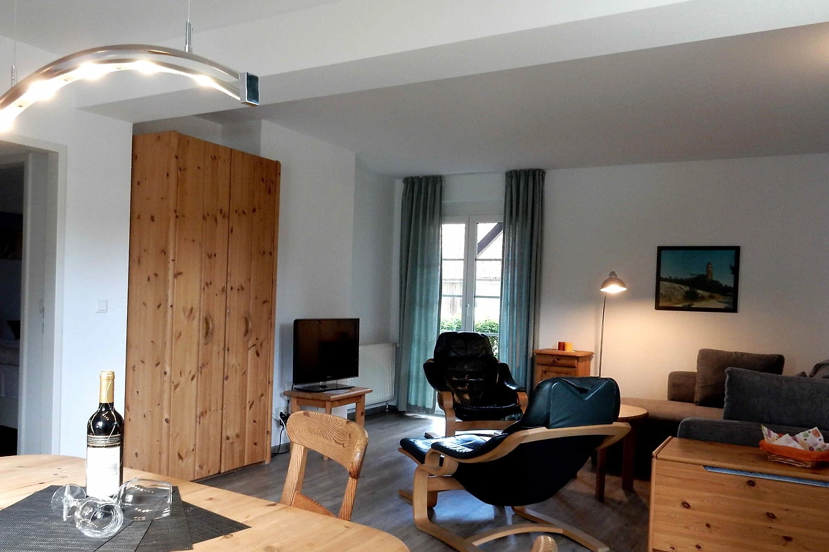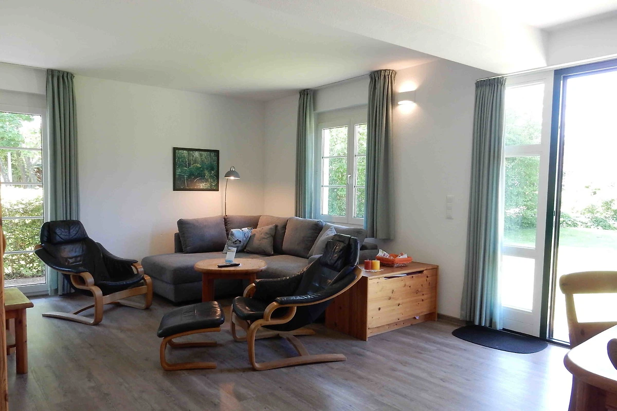 2 Zimmer ca. 54 qm, EG im Haus A, Residenz Kormoran, Grüne Strasse 45A-R, Ostseebad Prerow, für 1-4 Personen. Wohnzimmer mit Schlafcouch, WLAN, Sitzgarnitur, SAT-TV/Radio, Esstisch, Küchenzeile, Schlafzimmer, Dusche/WC, extra WC, Terrasse