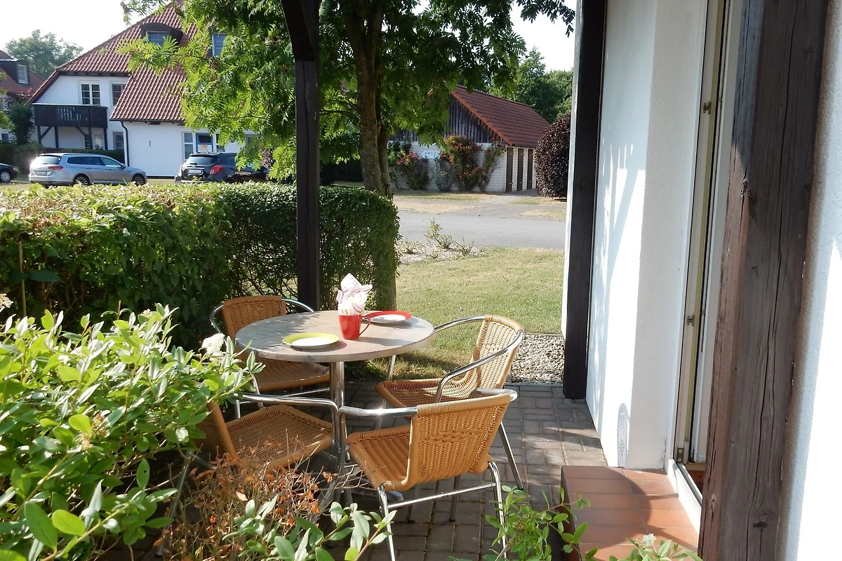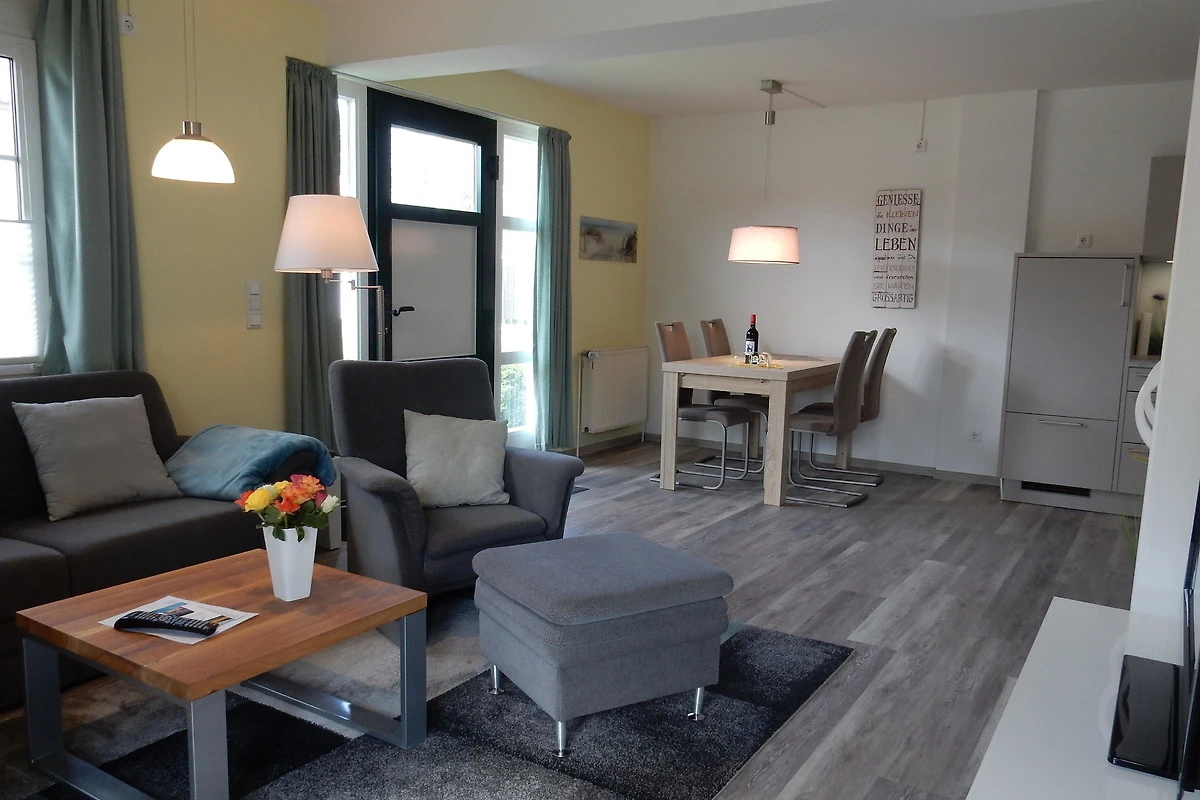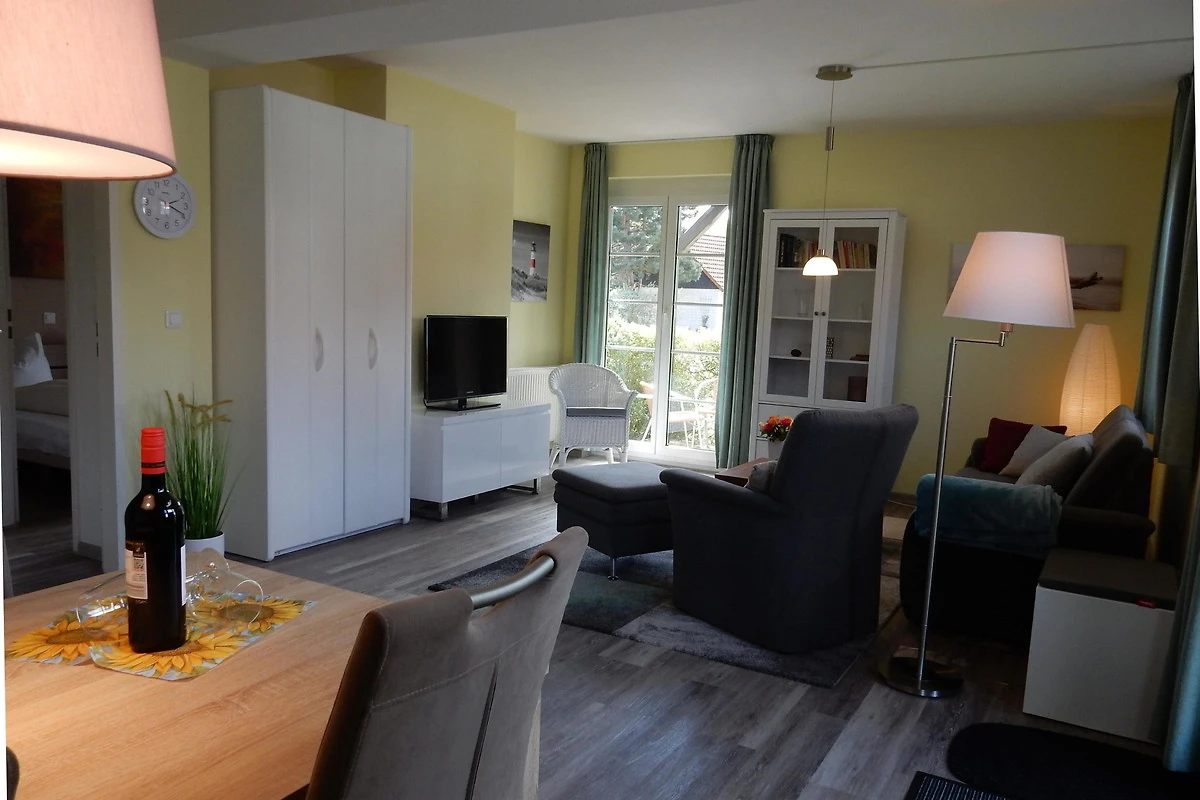 2 Zimmer ca. 54 qm, EG im Haus A, Residenz Kormoran, Grüne Strasse 45A-R, Ostseebad Prerow, für 1-4 Personen. Wohnzimmer mit Schlafcouch, WLAN, Sitzgarnitur, SAT-TV/Radio, Esstisch, Küchenzeile, Schlafzimmer, Dusche/WC, extra WC, Terrasse