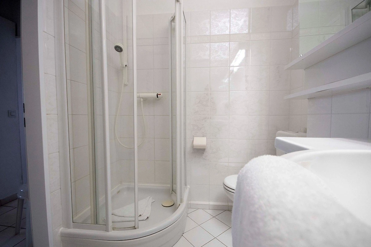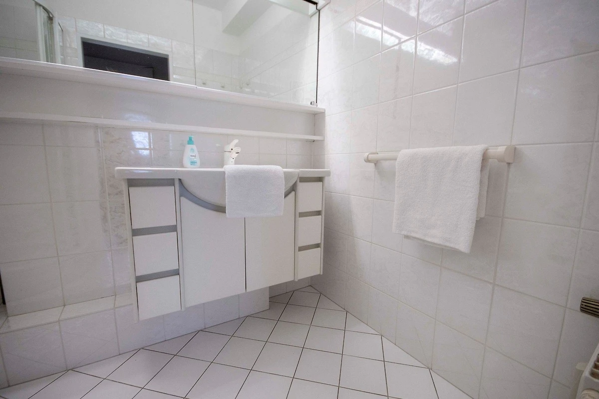 Praktische Annehmlichkeiten wie gemeinschaftlich nutzbare Waschmaschinen und Trockner sorgen für zusätzlichen Komfort. Ein besonderes Highlight ist der überdachte Balkon, der einen beeindruckenden Blick auf das Meer bietet. Die Ferienwohnung ist ideal für Familien und bietet Zugriff auf einen Indoor-Pool und eine Sauna, die sich ebenfalls im Haus befinden.