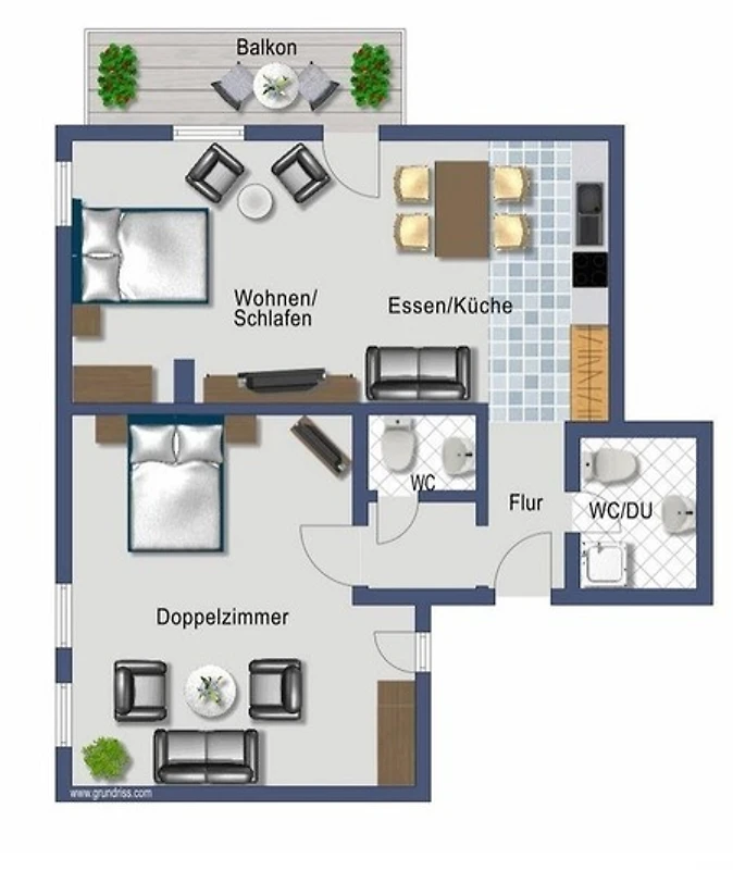 Die Ferienwohnung ist behaglich eingerichtet. Ihnen steht eine geräumige und gut ausgestattetet Wohnküche zur Verfügung. Französischer Balkon. In der Wohnküche gibt es einen Esstisch, Sessel, Sofa und TV-Gerät. Zudem befindet sich dort ein Doppelbett. Des Weiteren gibt es ein separates Wohn-Schlafzimmer mit Doppelbett und Sofagarnitur. Das Bad verfügt über eine Dusche. Ein Gäste-WC ist ebenfalls vorhanden.