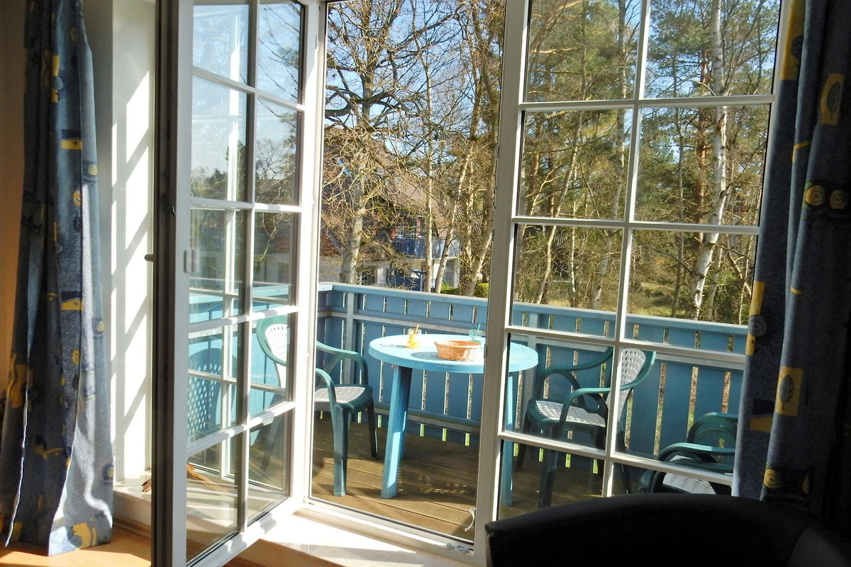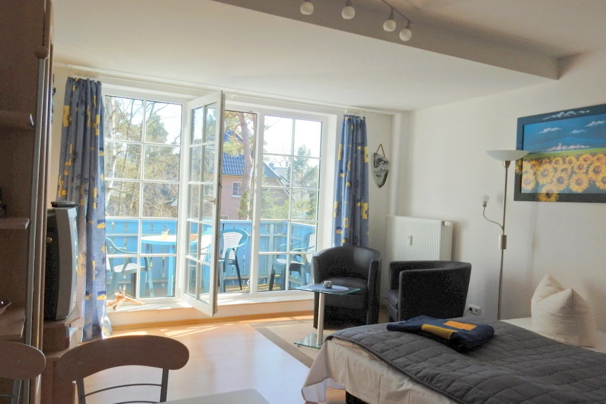 1 Zimmer ca. 39 qm für 1-2 Personen, 1. OG im Gästehaus Kormoran, Waldstrasse 64 C,Ostseebad Prerow. Wohnzimmer mit Doppelbett, Sitzgarnitur, TV/Radio, Esstisch, Küchenzeile (Spülmaschine), Bad/WC, Süd-West-Balkon, WLAN.