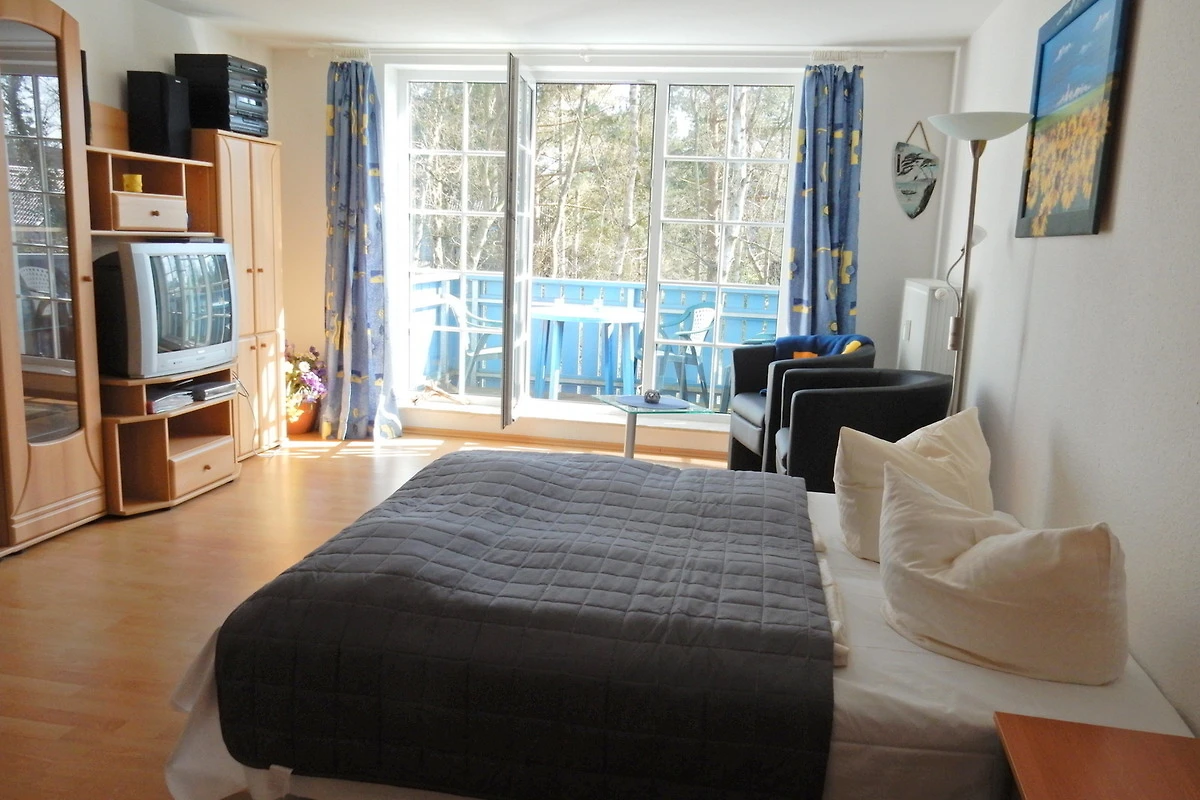 1 room about 39 sqm for 1-2 people. Living room with double bed, sofa, TV / radio, dining table, kitchenette, bath / WC, south-west balcony, WLAN