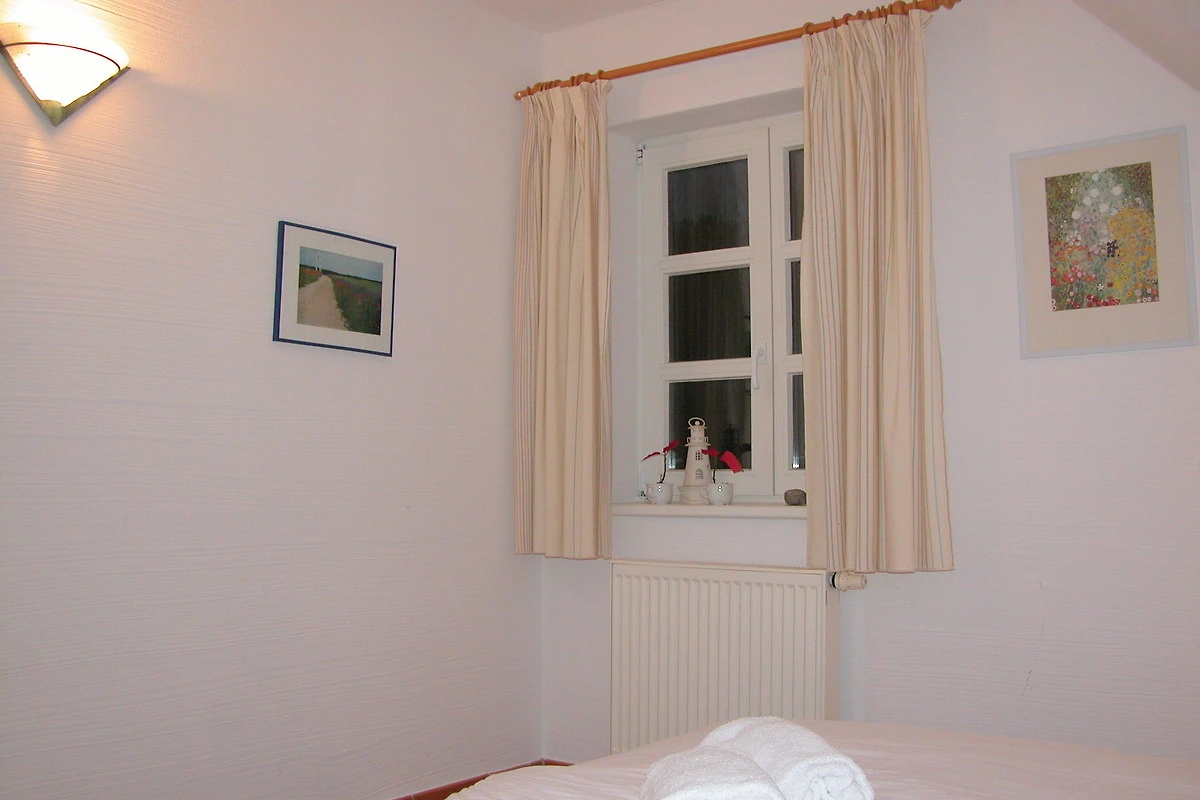 2 Zimmer ca. 40 qm für 1-4 Personen, DG im Ferienparadies Rugana, Nonnevitz 25 a+b, 18556 Dranske-Bakenberg. Wohnzimmer mit Schlafcouch, Sitzgarnitur, TV/Radio, Esstisch, Küchenzeile mit Spülmaschine, Schlafzimmer mit Doppelbett. Dusche/ WC.
