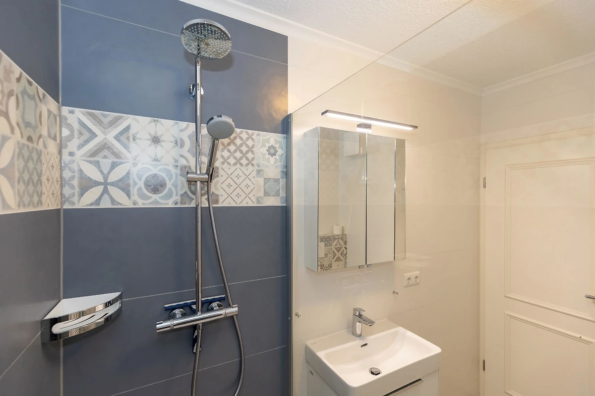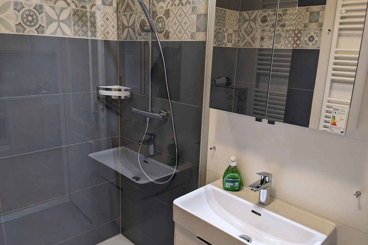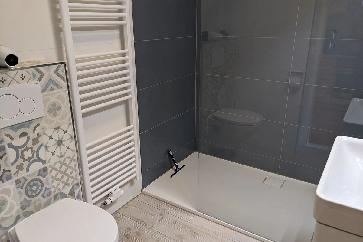 Das komplett geflieste Badezimmer verfügt über eine Dusche, ein WC, ein Waschbecken mit Unterschrank für Ihre Badutensilien sowie einen Handtuchheizkörper. Auch ein Föhn ist vorhanden.
