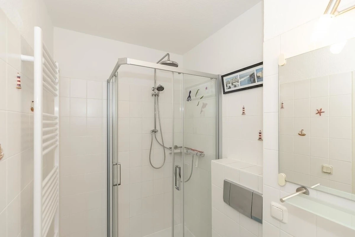 Das Badezimmer verfügt über eine Dusche, ein WC und ein Waschbecken und ist vom Flur aus zu erreichen.