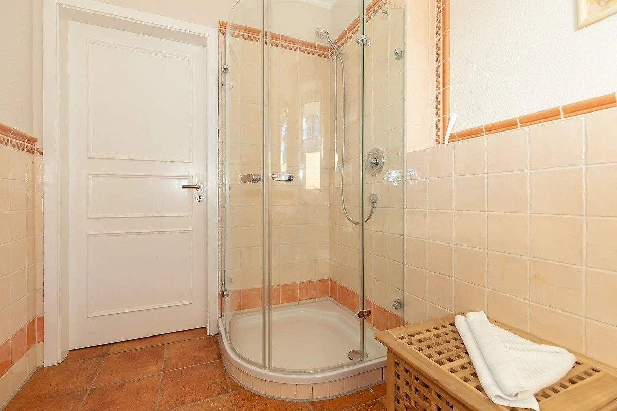 Das Badezimmer besitzt eine schöne Runddusche und einen Waschtisch mit grossem Spiegel.