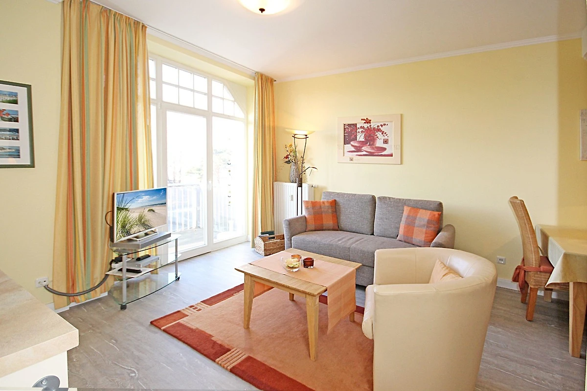 Im geschmackvoll möblierten, komfortablen Wohnzimmer befinden sich eine gemütliche Couchgarnitur und ein Sessel zum Entspannen, und zur Unterhaltung dienen ein TV, DVD-Player und HiFi-Anlage. Die Couch ist ausziehbar und bietet 2 Personen eine Schlafmöglichkeit für die Nacht.