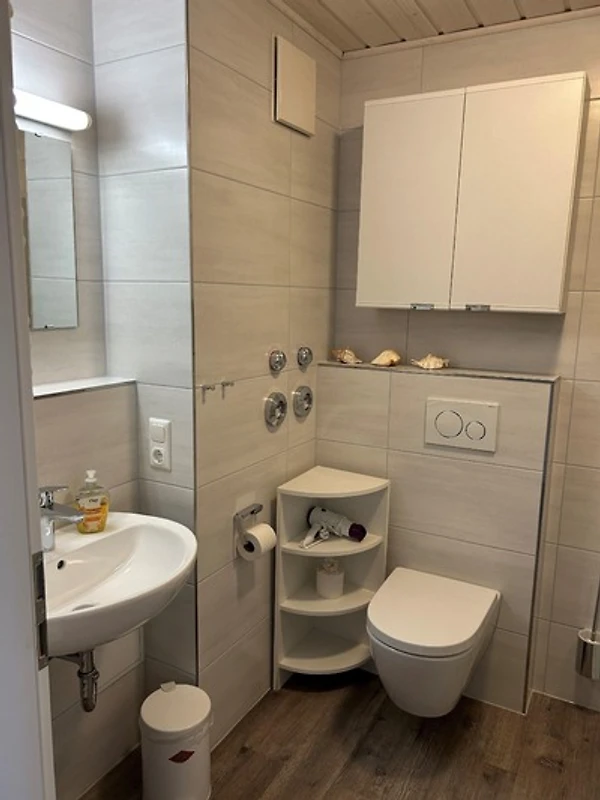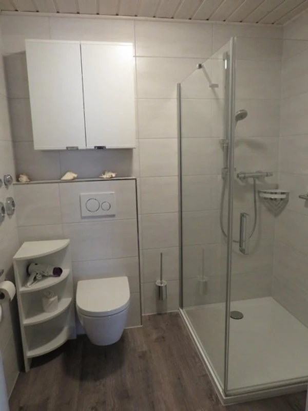Das Badezimmer verfügt über eine Dusche, ein WC, ein Waschbecken sowie einen Handtuchheizkörper.