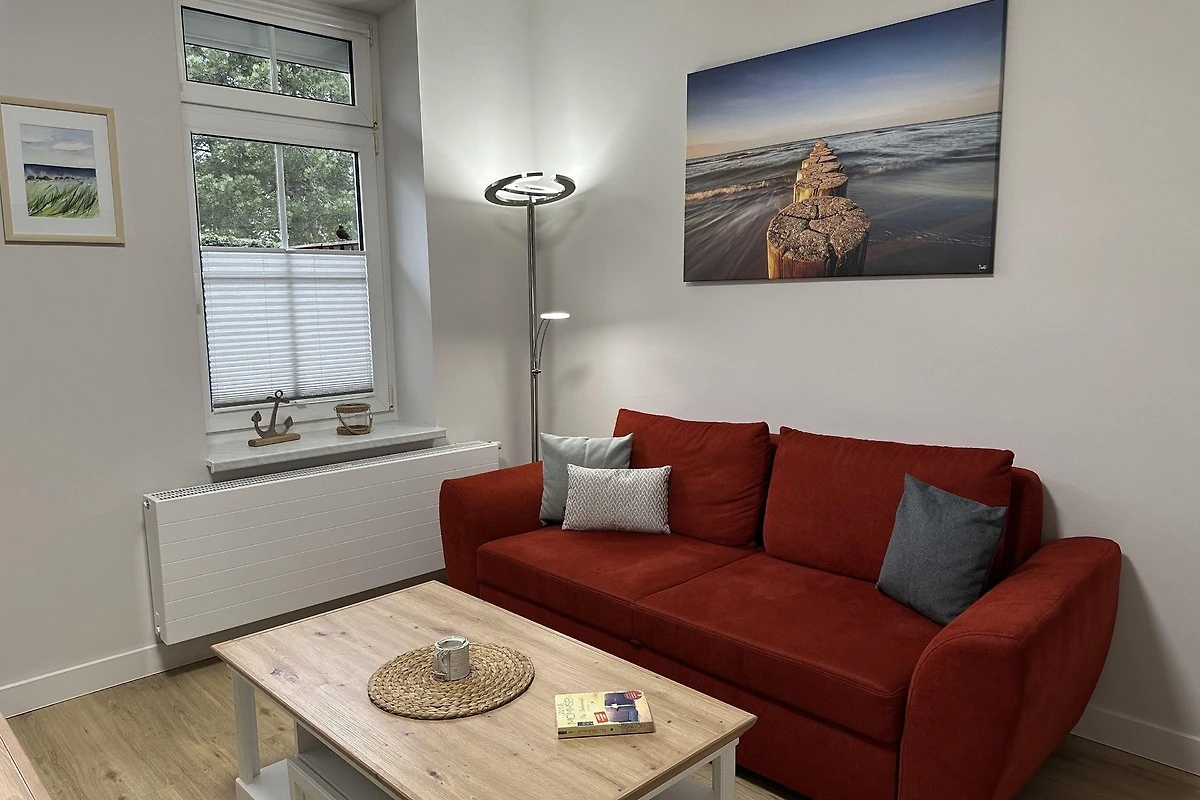 Im geschmackvoll gestaltetem Wohnraum mit bequemer Couch können Sie entspannte Stunden verbringen.