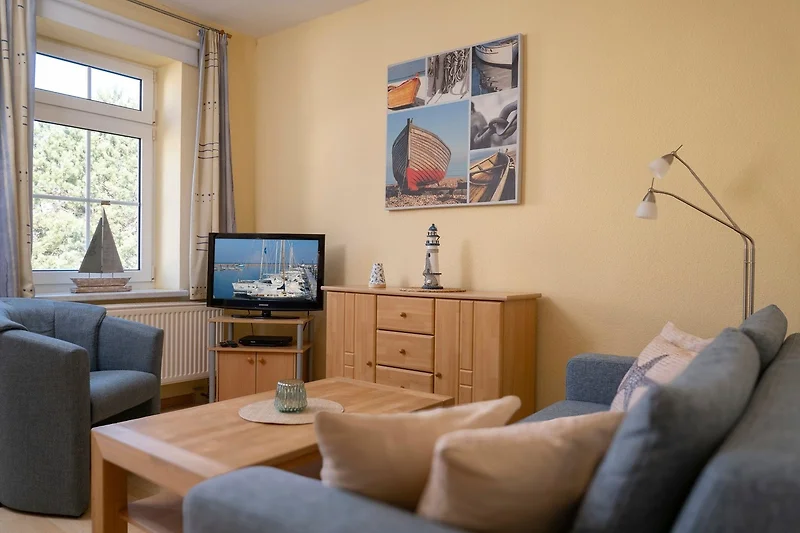 Im Wohnzimmer mit Doppelschlafcouch erwarten Sie eine Flachbild-TV mit Bluray-Player sowie abwechslungsreiche Bücher und Spiele für Kinder und Erwachsene.