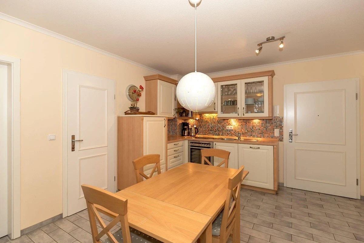 Gleich im Anschluss befindet sich der offene Küchenbereich mit Geschirrspüler, Herd mit Ceranfeld und Backofen. Ein Grilltoaster, ein Handmixer und viele weitere Küchenutensilien sind hier für Sie vorhanden. Ein Gefrierfach steht ebenfalls zur Verfügung.