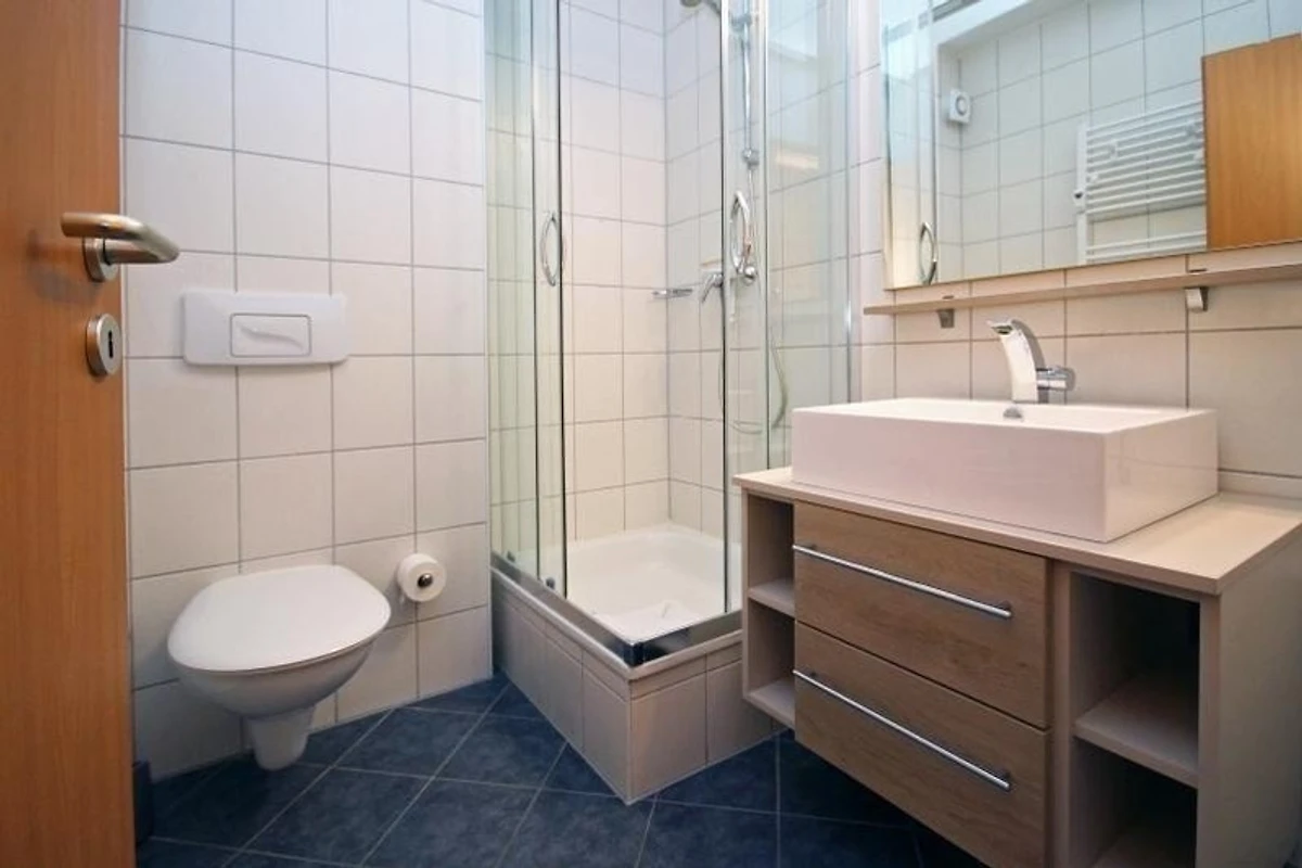 Das Badezimmer verfügt über eine Dusche, ein WC, einen Handtuchheizkörper sowie ein Waschbecken mit Unterschrank für Ihre Badutensilien.