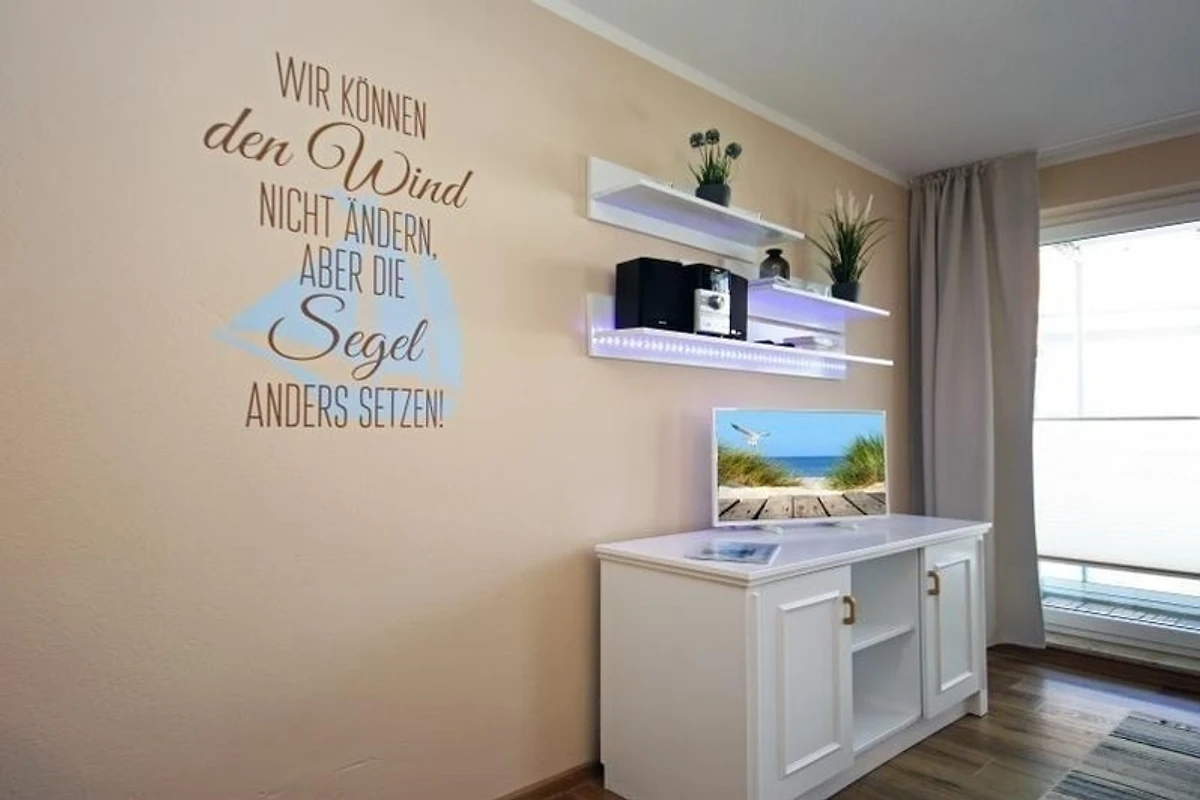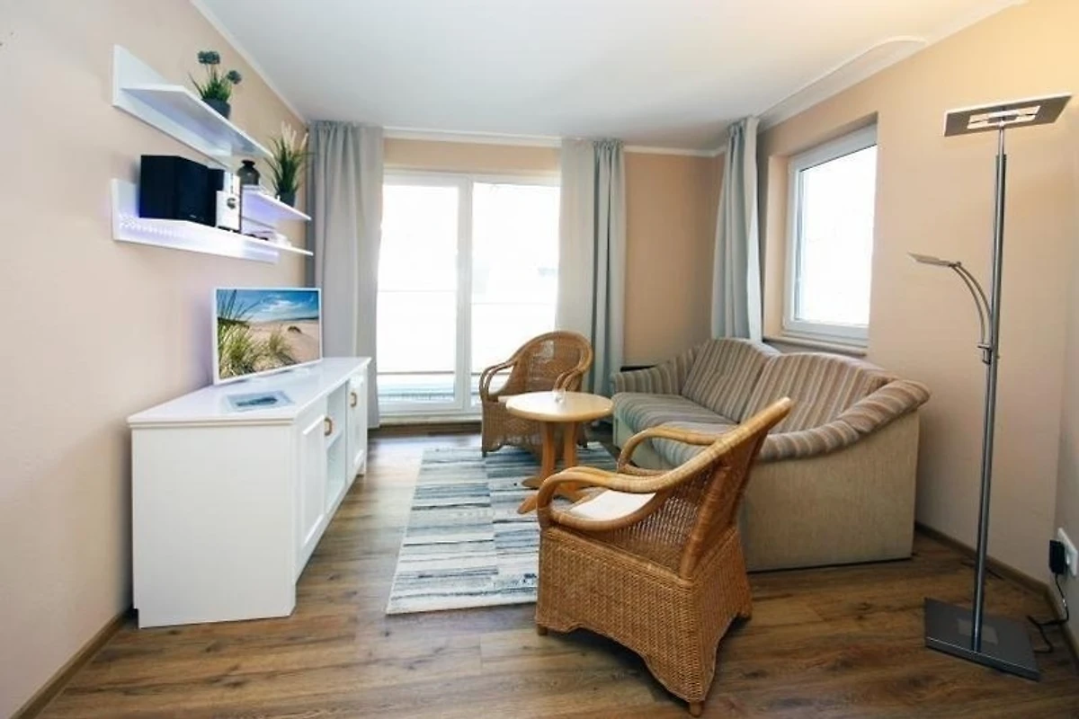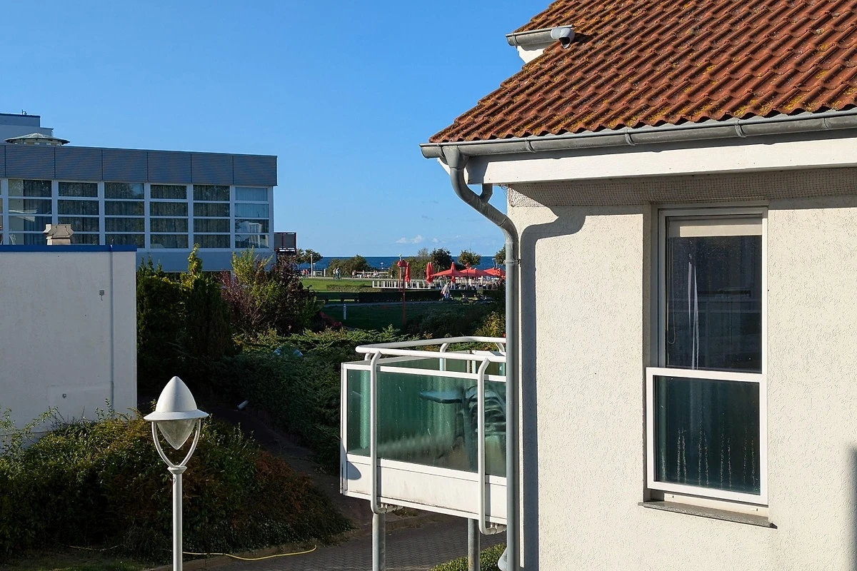 An Ihre Wohnung grenzt ein Balkon zur Nordseite, den Sie direkt von Ihrem Wohnzimmer aus betreten können. Ausgestattet mit Möbeln und einem Balkontisch, können Sie hier die Ostseeluft geniessen und am Abend einen ereignisreichen Tag gemütlich ausklingen lassen.