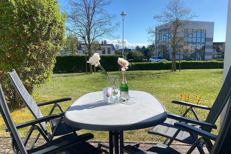 Schon beim Betreten der windgeschützten Südterrasse kommt Urlaubsstimmung auf! Hübsche Gartenmöbel laden zum Verweilen ein, so können Sie aufgrund der Lage den ganzen Tag die Sonne geniessen. Und am Abend bei einem leckeren Getränk einen ereignisreichen Tag gemeinsam ausklingen lassen - Ostsee-Feeling pur!