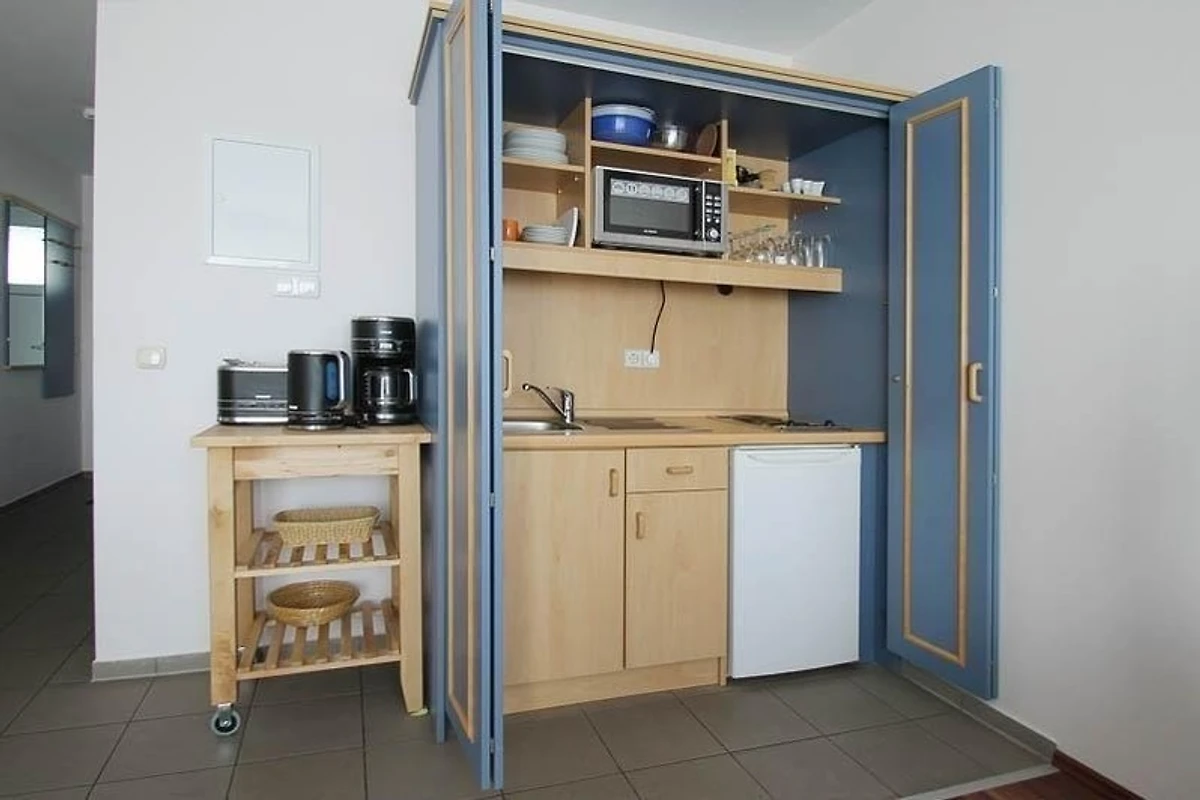 An den Wohnbereich grenzt der Essbereich mit einer kleinen Küchenzeile, die voll ausgestattet ist. Hier finden Sie einen 2-Platten-Herd, Kühlschrank, Mikrowelle mit Heissluft und Grill, Toaster, Kaffeemaschine, Wasserkocher und natürlich genügend Geschirr.