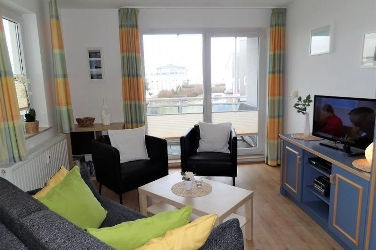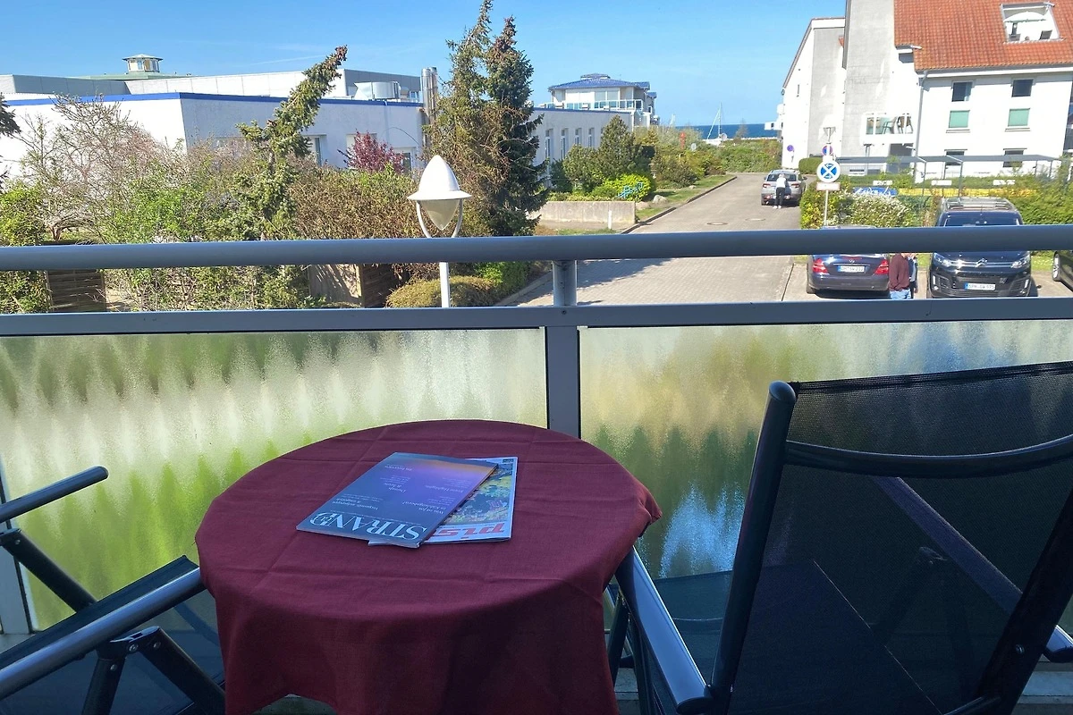 An Ihre Wohnung grenzt ein windgeschützter Balkon zur Nordseite, der mit einem Tisch, einer Gartenbank, 2 Stühlen, Auflagen und einem Wäscheständer ausgestattet ist und den Sie vom Wohnzimmer aus betreten können.
