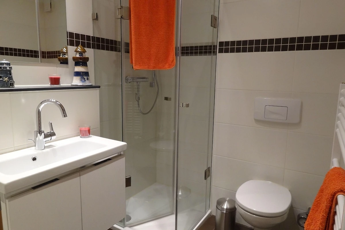 Das Badezimmer ist modern eingerichtet mit WC, einem Handtuch-Heizkörper, einem Waschtisch mit Unterschrank und einer Echtglas-Dusche, die einen niedrigen Einstieg besitzt sowie genügend Ablagemöglichkeiten für Ihre Badutensilien.