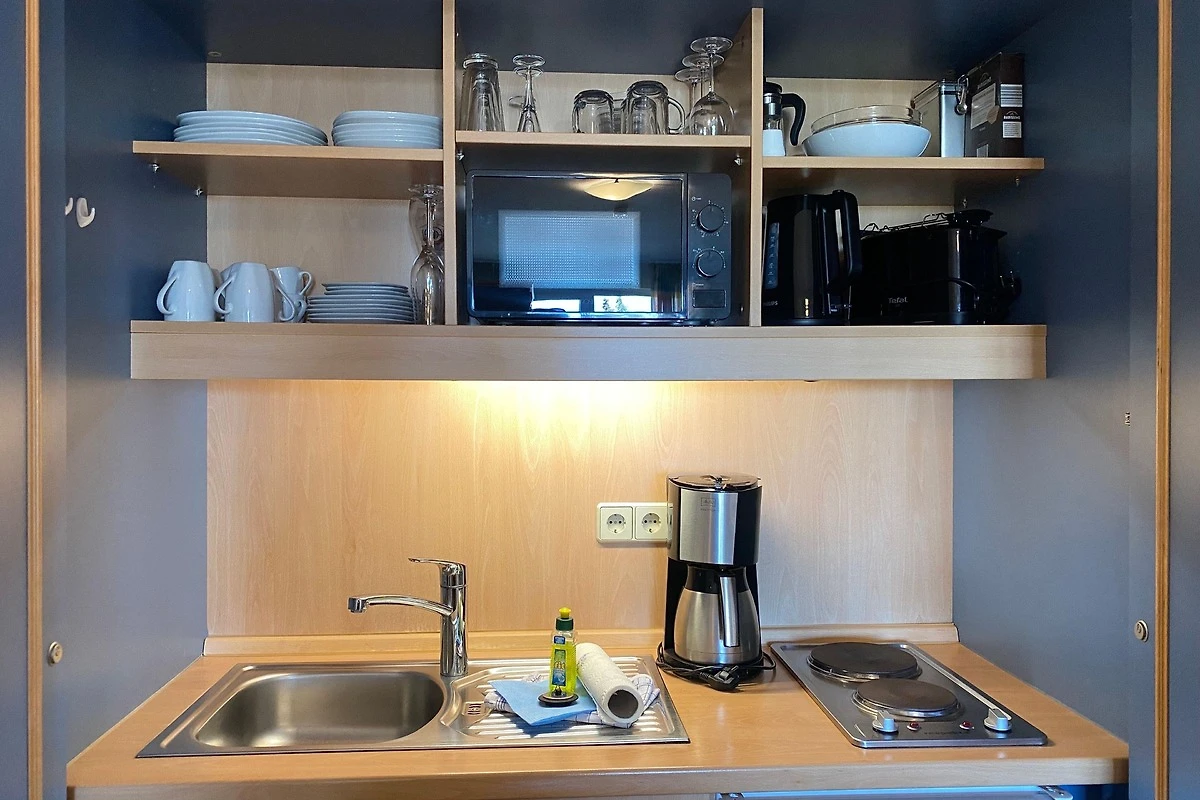 An den Wohnbereich grenzt eine Pantry-Küche, welche voll ausgestattet ist. Hier finden Sie einen 2-Platten-Herd, Mikrowelle mit Grillfunktion, Kühlschrank, Toaster, Thermo-Kaffeemaschine, Wasserkocher und natürlich ausreichend Geschirr.