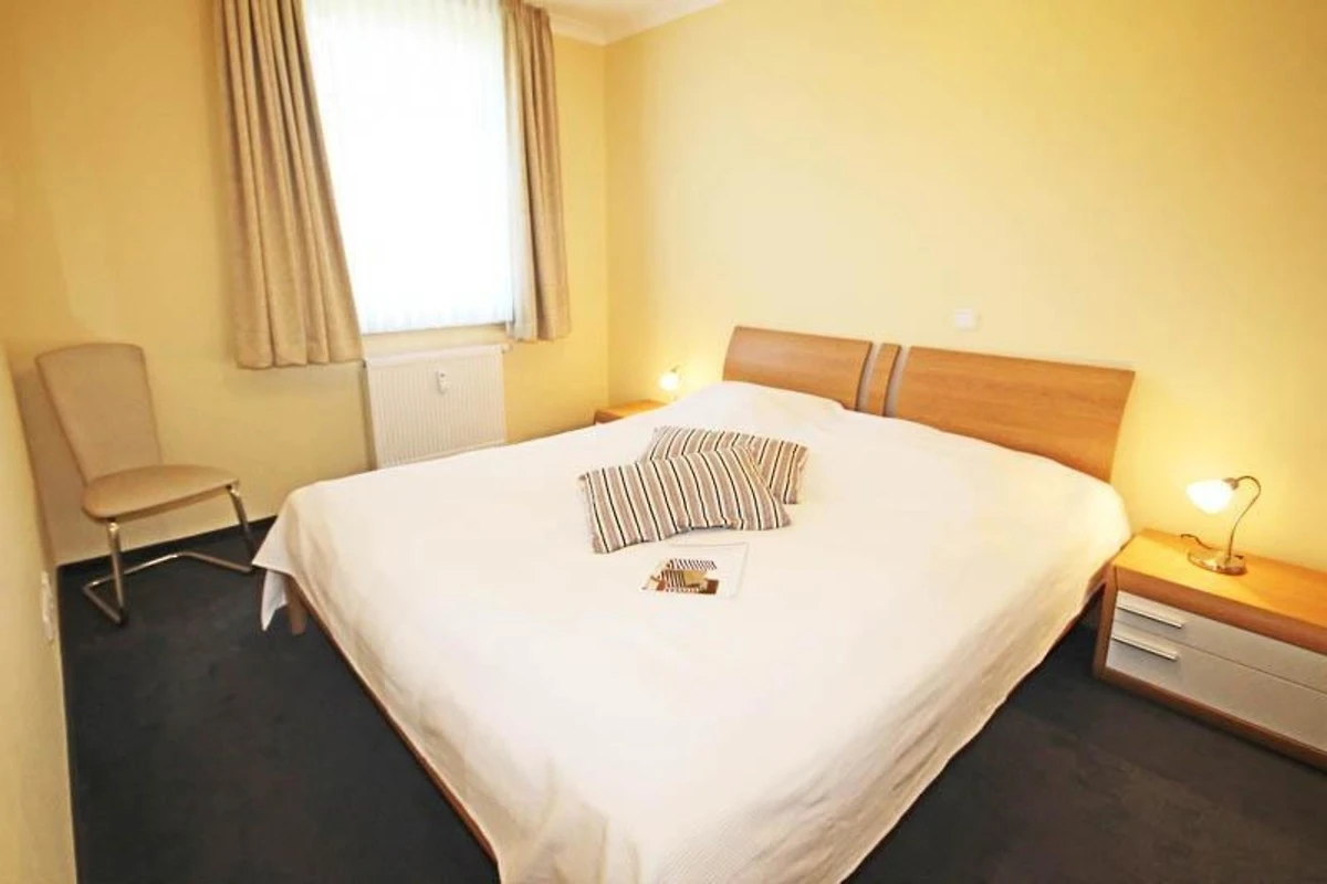Das Schlafzimmer ist mit einem bequemen Doppelbett und einem geräumigen Kleiderschrank für Ihre Urlaubsgarderobe eingerichtet.
