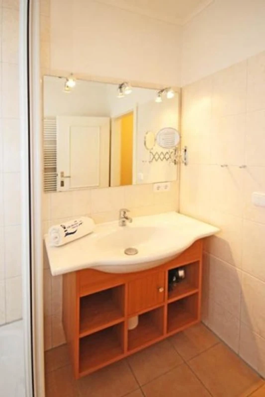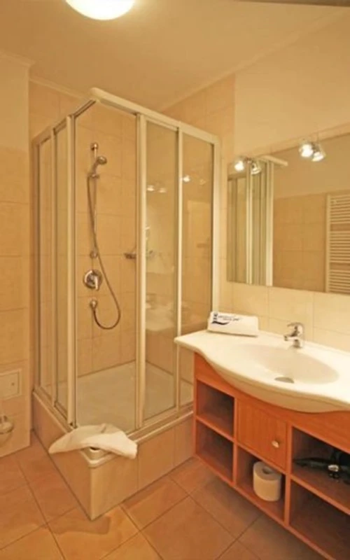 Das Badezimmer verfügt über eine Dusche, ein WC und ein Waschbecken mit Unterschrank.