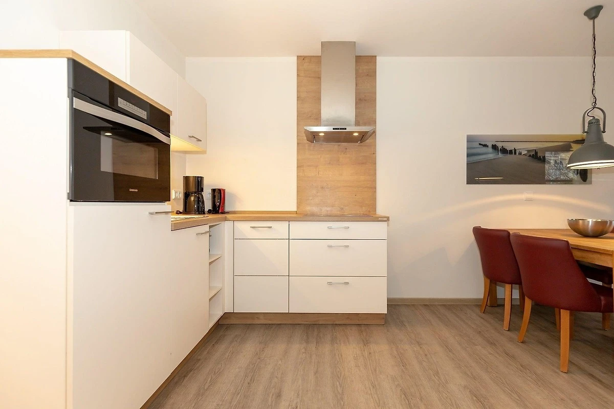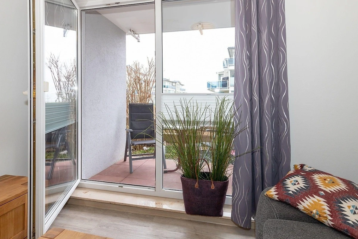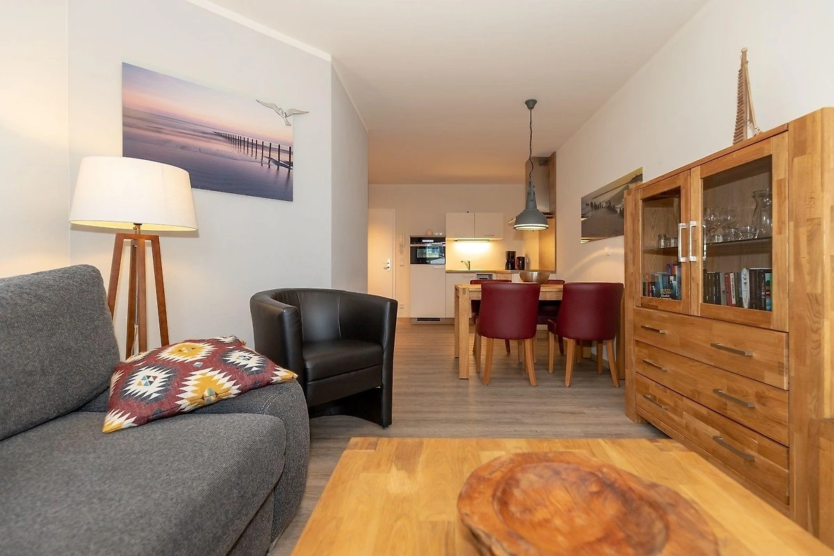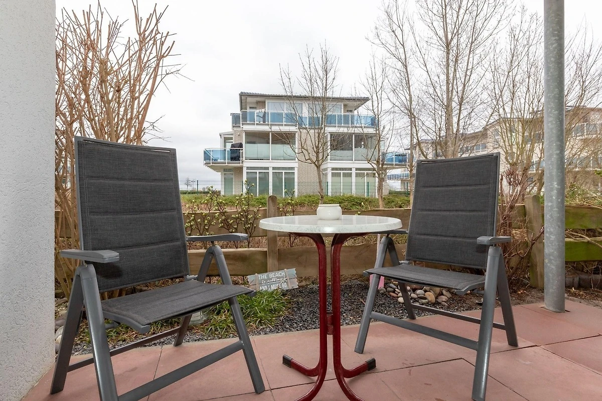An Ihre Wohnung grenzt eine windgeschützte Terrasse zur Nordseite, die Sie direkt von Ihrem Wohnzimmer aus betreten können. Die Terrasse ist mit ansprechenden Möbeln eingerichtet, sodass Sie hier Sonne tanken oder abends bei einem Glas Wein den Tag ausklingen lassen können.