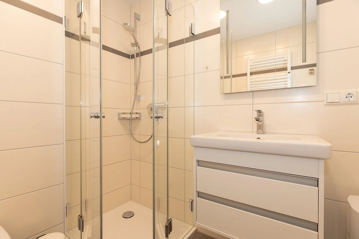 Das Badezimmer verfügt über eine Dusche, ein WC sowie einen Waschtisch mit Unterschrank für Ihre Badutensilien.