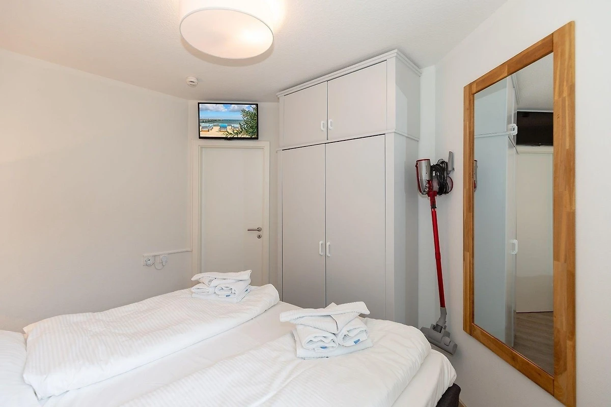 Das separate Schlafzimmer ist mit einem komfortablen Boxspringbett eingerichtet - hier liegen Sie richtig! Für Ihre Urlaubsgarderobe steht Ihnen ein geräumiger Kleiderschrank zur Verfügung. Ein zweiter Fernseher ist ebenfalls vorhanden.