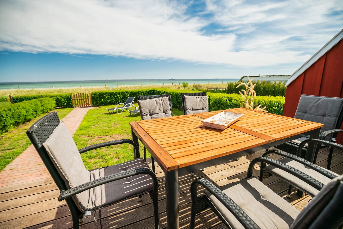 Sonne tanken kannst Du auf der erhöhten Holz-Terrasse. Gartenmöbel, Liegen und ein Sonnenschirm stehen für Dich bereit. Zum Strand gelangst Du über den eigenen Zugang in wenigen Schritten.