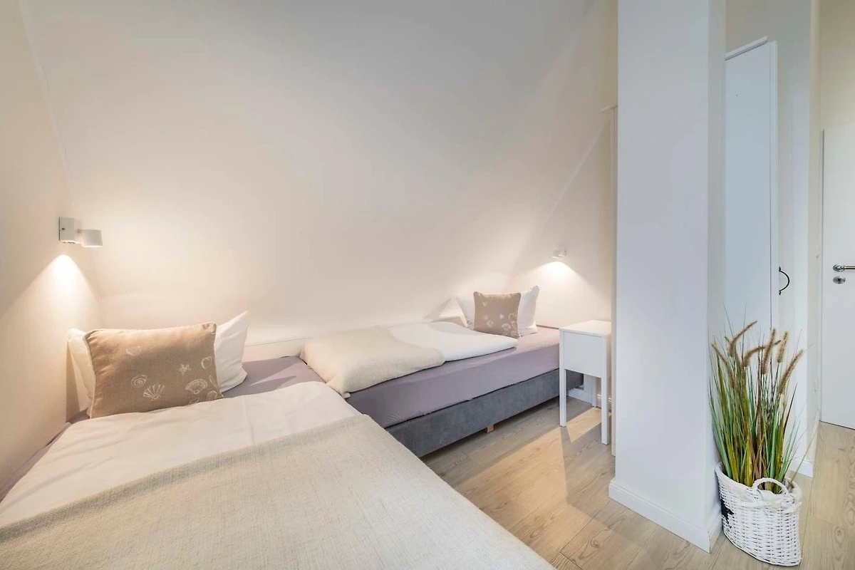 Zimmer 1 mit Doppelbett, Zimmer 2 und 3 mit jeweils zwei Einzelbetten. Die gemütlichen Boxspringbetten vereinen Design und hohen Schlafkomfort.