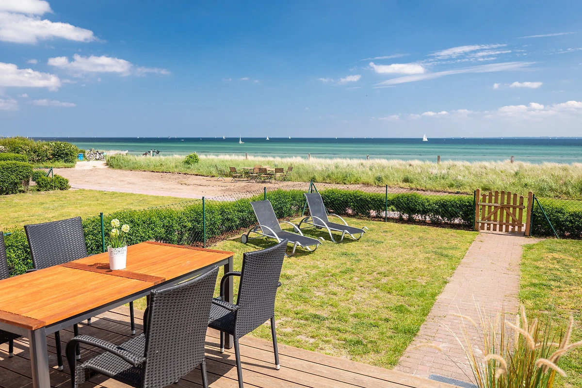 Sonne tanken kannst Du auf der erhöhten Holz-Terrasse. Gartenmöbel, Liegen und ein Sonnenschirm stehen für Dich bereit. Zum Strand gelangst Du über den eigenen Zugang in wenigen Schritten.