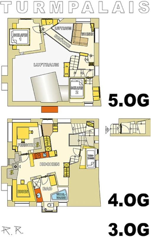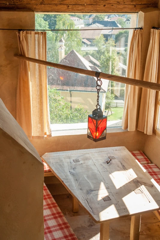 Das Turmpalais befindet sich auf der höchsten Ebene im mittelalterlichen Turm mit herrlicher Aussicht in alle Himmelsrichtungen. Hier präsentiert sich über den Dächern von Trostberg ein Feriendomizil mit drei Wohnebenen für bis zu fünf Personen.