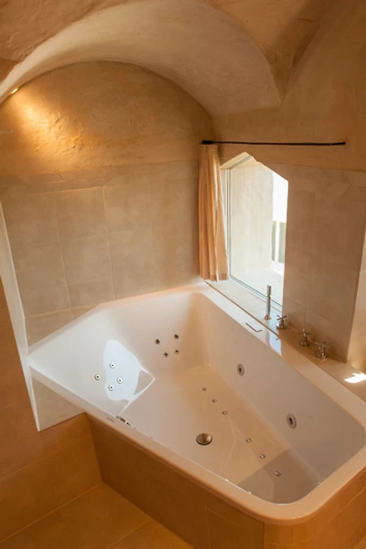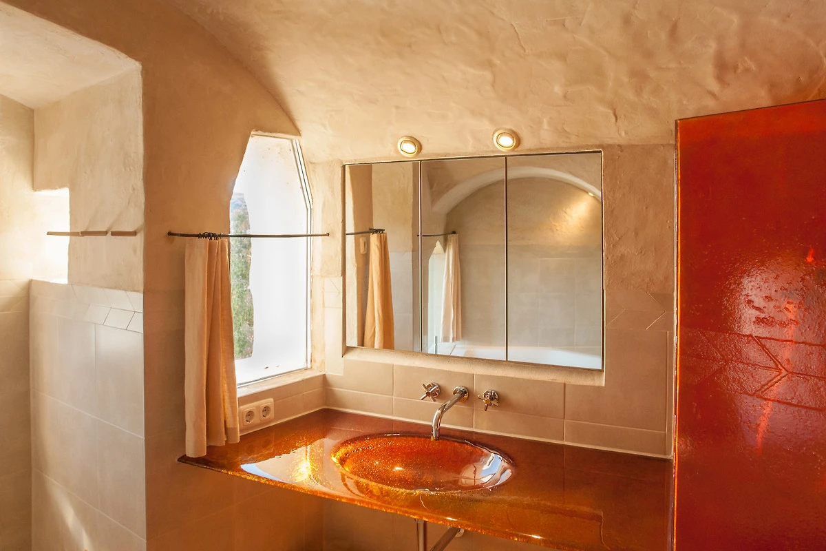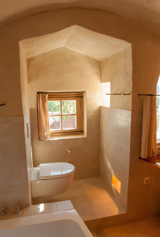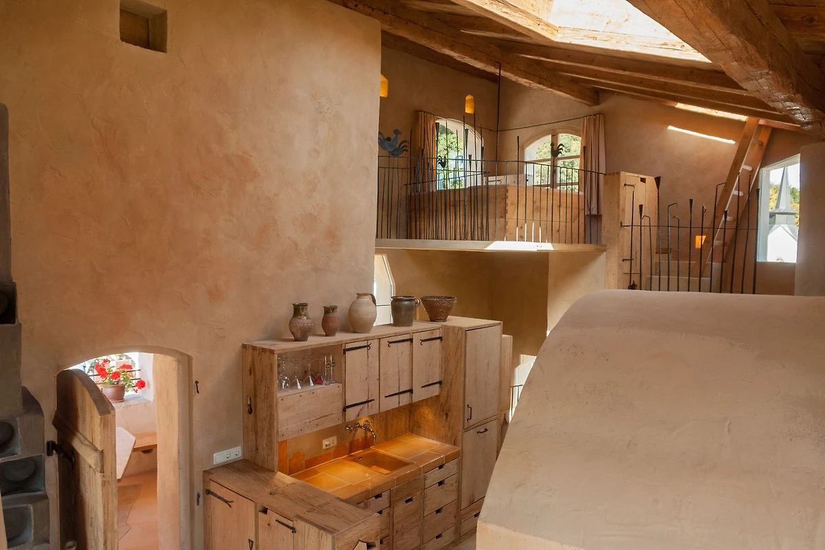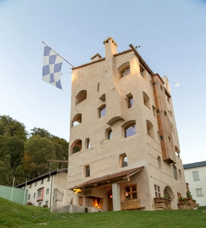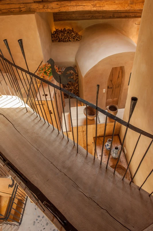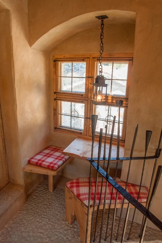 Ein grosszügiger Wohnbereich mit grosser Dachverglasung, offener Feuerstelle, Kachelofen und traumhafter Wohngalerie sind zweifelsohne Blickfang dieser Ferienwohnung. Von hier erschliesst sich der wunderbare Freisitz im malerischen Laubengang mit offener Feuerstelle, das Turmzimmer mit Massivholzbett und Blick auf den Schloss Innenhof und das Badezimmer in der archaischen Gewölbekuppel. Das Bad ist mit exklusiver Whirlwanne, entspannender Regendusche und weitem Blick auf den Horizont eine Wellnessoase für Körper und Seele.