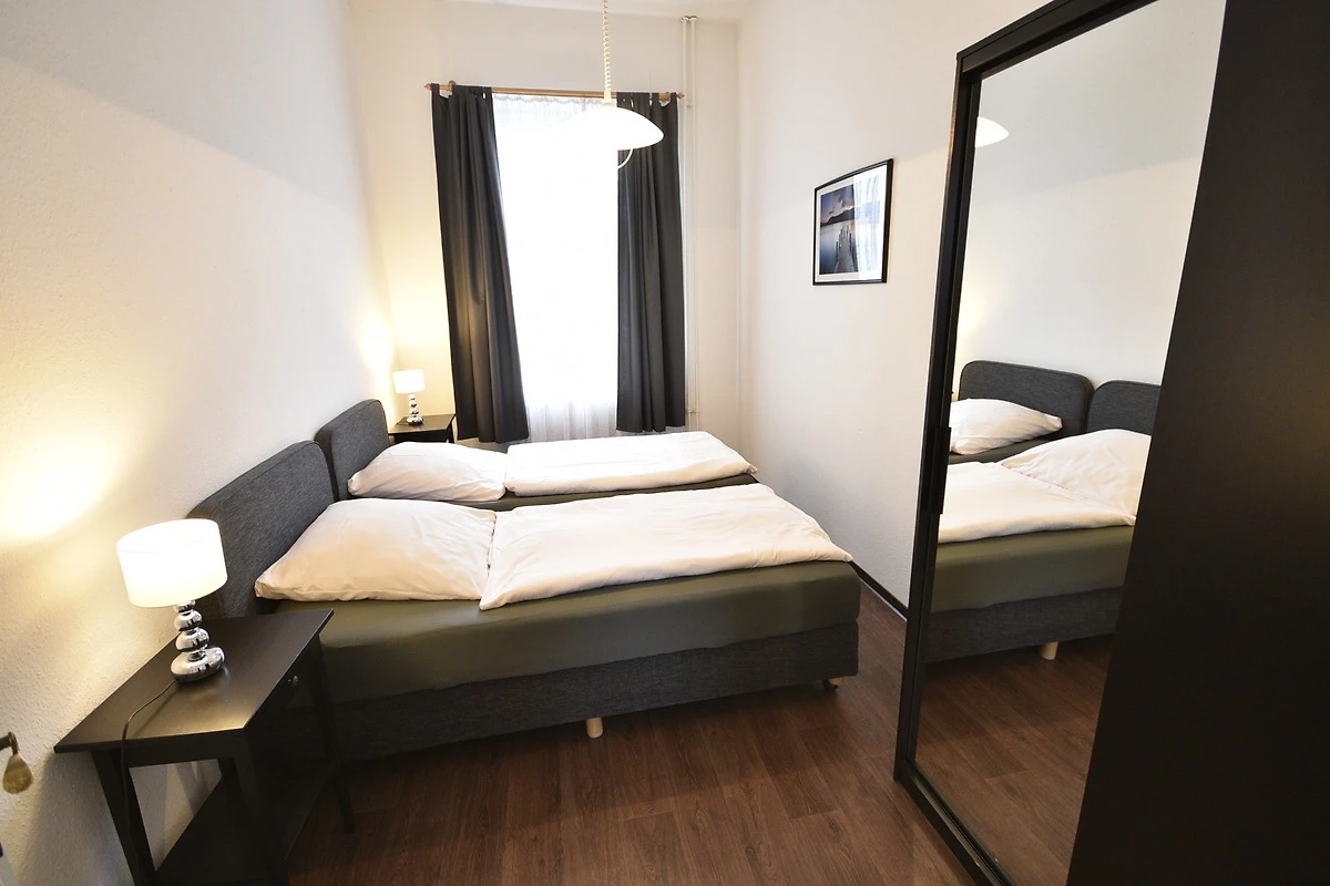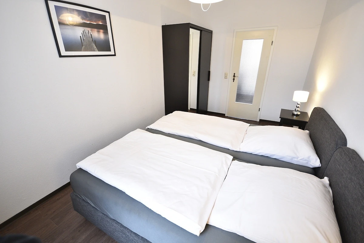 Das Appartement verfügt über ein Schlafzimmer mit zwei zusammenstehenden Einzelbetten und einem Kleiderschrank, sowie ein Wohn-/Schlafzimmer mit einem Doppelschlafsofa.
