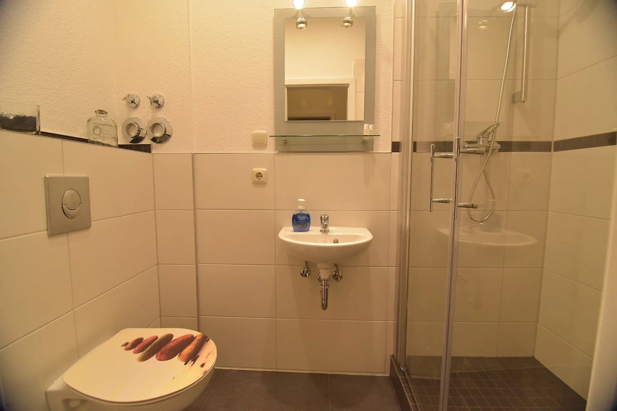 Im Badezimmer finden Sie: Dusche, Handtücher, Spiegel, Waschbecken, Fön und ein WC.