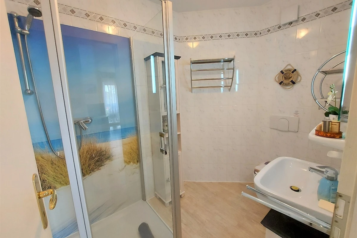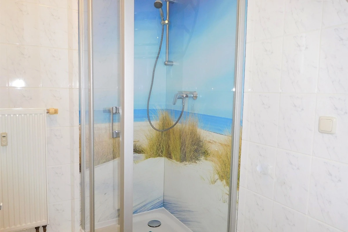 Im Bad erwartet sie zum entspannen eine schöne Dusche. Auch ihr Auto hat einen eigenen PKW-Stellplatz auf dem Hof.