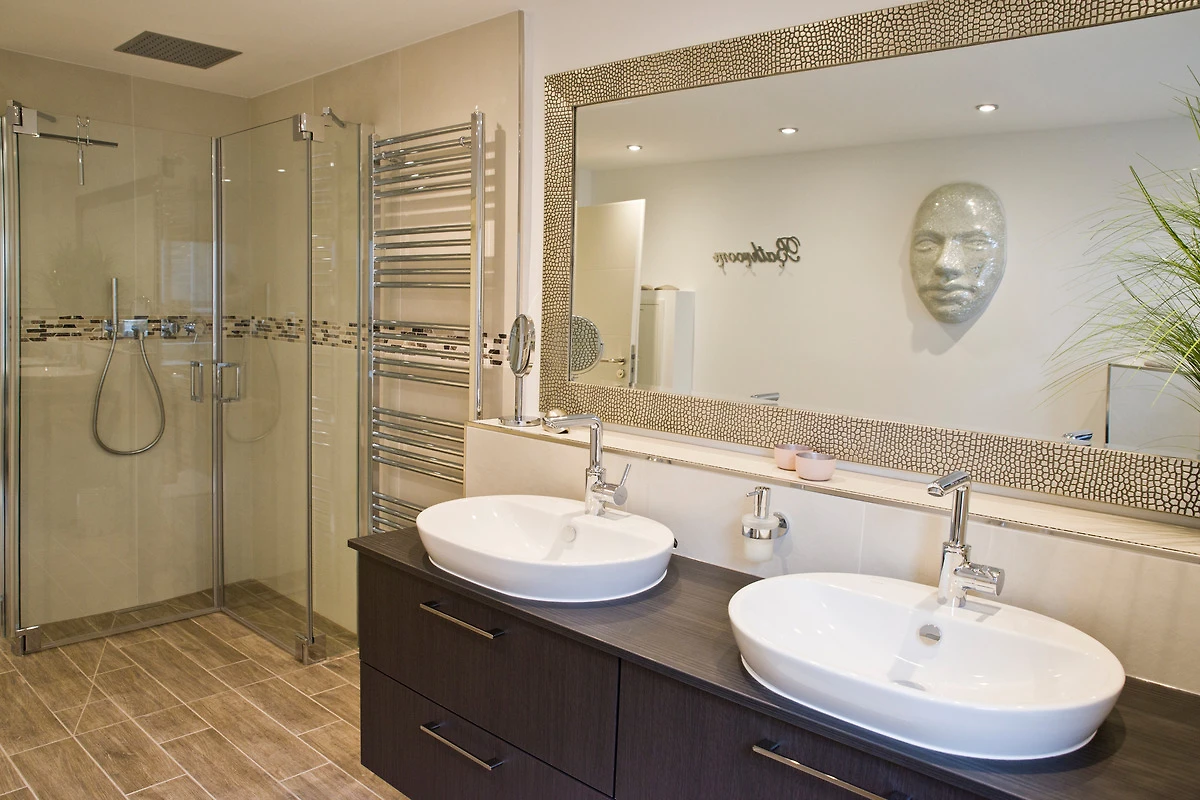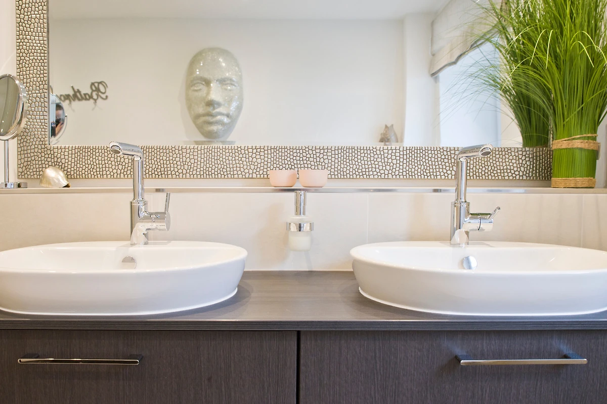 Die beiden, grosszügig gestalteten Design Badezimmer mit Fussbodenheizung, Ganzglasduschkabinen mit bodengleichen Zugang präsentieren sich als Wohlfühloase mit reichlich Platzangebot: Raindance-Deckendusche und separate Handbrause, Handtuchwärmer, grosse Design Aufsatzwaschtische, jeweils 2 Bad-Unterschränke mit 4 grossen Vollauszugsschubladen, grosser 180 x 100 m Design-Spiegel, Fön, Kosmetikartikel, 5-fach-Vergrösserungsspiegel, alle Fenster mit Plissee. Handtücher und Duschtücher kostenlos.