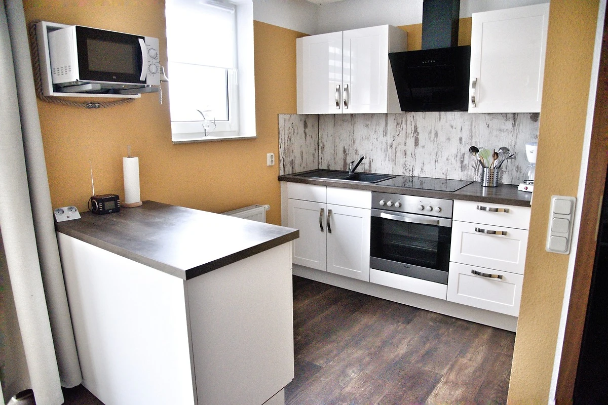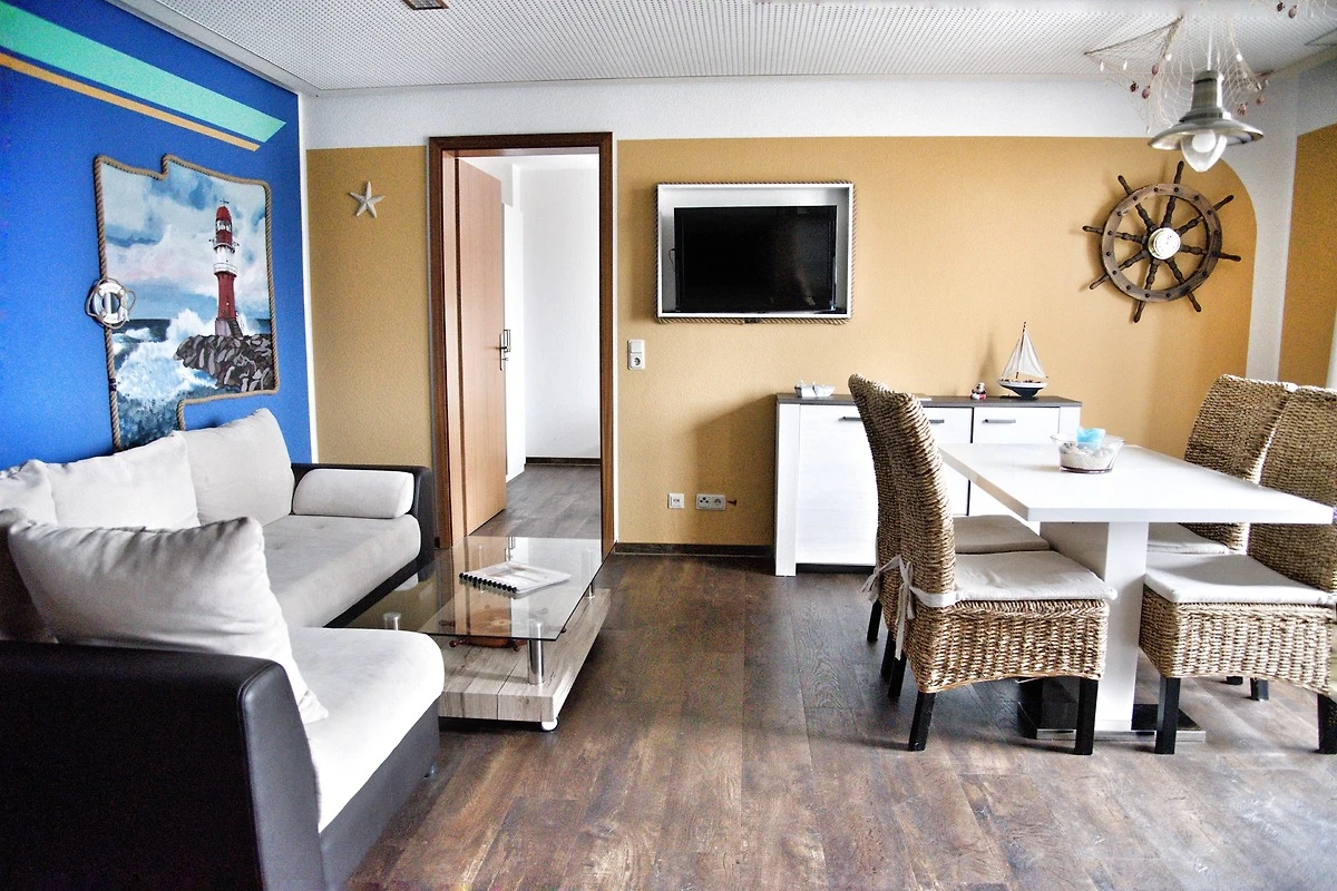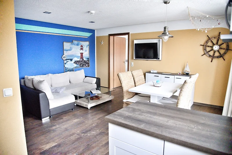 Ihr lichtdurchflutetes Wohnzimmer verfügt über einen Esstisch mit vier Stühlen und ein ausziehbares Schlafsofa mit einem Schlafplatz für zwei Personen. Sollten die Tage doch einmal weniger sonnig ausfallen, versüsst Ihnen die indirekte LED-Beleuchtung den Aufenthalt in der Wohnung. Die neue Wohnküche ist zum Wohnzimmer hin teiloffen, was den Raum noch grosszügiger erscheinen lässt. Multimedial steht Ihnen hier ein grosser Flachbildfernseher mit Kabelanschluss zur Verfügung. Auch einige Gesellschaftsspiele dürfen hier im Bestand nicht fehlen. Im Schlafzimmer befinden sich ein komfortables Doppelbett mit höhenverstellbaren Lattenrosten sowie ein grosszügig bemessener Kleiderschrank. Ihre Koffer können Sie hier bequem auspacken. Ihre Küchenzeile ist voll ausgestattet. Bestandteile sind unter anderem ein Cerankochfeld, eine Kaffeemaschine, ein Backofen, viel Geschirr sowie eine Kühlschrank mit Gefrierfach. Ihren kulinarischen Ideen sind hier keine Grenzen gesetzt. Ihr Badezimmer verfügt über eine Dusche mit Duschkabine, einen Fön und Ablageflächen. Ihr Flur verfügt über eine Garderobe und einen grossen Spiegel. Das Appartement Kehr Wieder! liegt im ersten Obergeschoss des Hauses Silbermöwe, im Eingang 2. In unmittelbarer Nähe dieses Appartements befinden sich weiter Ferienwohnungen unserer Gesellschaft. Eine gemeinsame Anmietung ist hier sehr gut möglich.