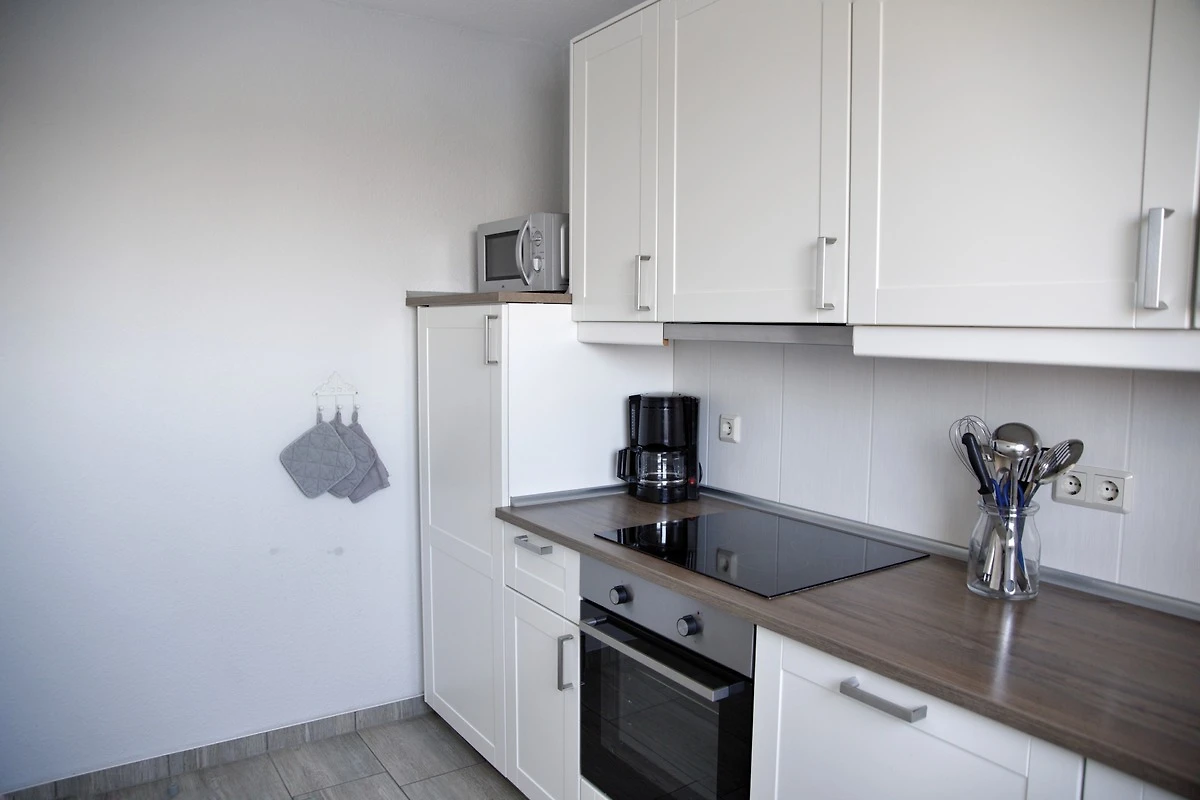 Ihre hochwertige Sterneküche ist für Sie voll ausgestattet. Bestandteile sind unter anderem ein Cerankochfeld, ein Backofen, eine Kaffeemaschine, eine Mikrowelle, viel Geschirr, ein Geschirrspüler, eine grosse Kühl- und Gefrierkombination und weiteres Equipment. Das Badezimmer hält eine Dusche mit Duschkabine, Ablageflächen und einen Fön für Sie bereit. Im Flur finden Sie eine Garderobe, einen grossen Spiegel und Reinigungsgeräte vor.