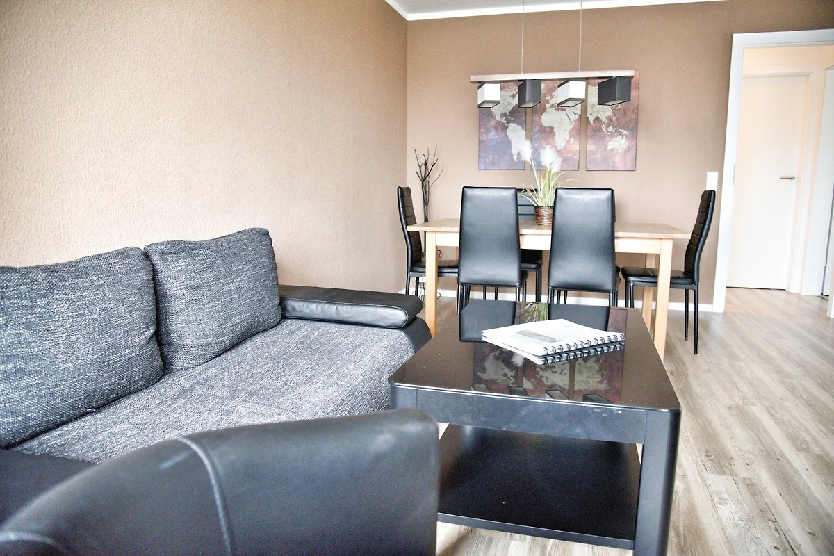 Ihr Wohnzimmer verfügt über einen Esstisch mit sechs Stühlen, ein ausziehbares Klappsofa mit einem Schlafplatz für zwei Personen und einen Sessel. Multimedial stehen Ihnen ein grosser Flachbildfernseher zur Verfügung. Die Ferienwohnung hat auch einen Kabelanschluss.