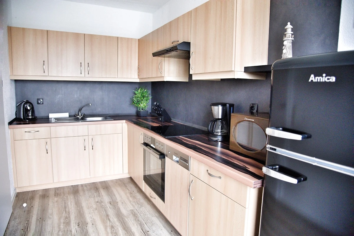 Die moderne Küche verfügt über eine komplett ausgestattete Küchenzeile, mit Cerankochfeld, Backofen, Geschirrspüler, Mikrowelle, viel Geschirr, sowie einem Kühlschrank mit kleinem Gefrierfach. Das neu geflieste Badezimmer hat eine Dusche mit ausreichend Ablageflächen. Ihre mitgebrachten Utensilien werden Sie hier gut verstauen können. Eine Garderobe im Flur ziert Ihren Eingangsbereich.