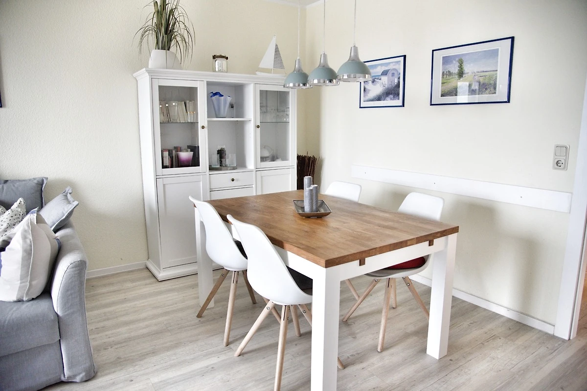 Ihr Wohnzimmer verfügt über einen Esstisch mit vier Stühlen, ein ausziehbares Ecksofa mit einem Schlafplatz für zwei Personen und einen Sessel. Multimedial steht Ihnen ein grosser Flachbildfernseher zur Verfügung. Die Ferienwohnung verfügt über einen Kabelanschluss.