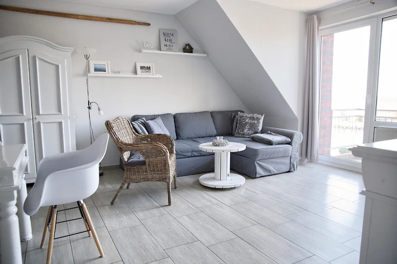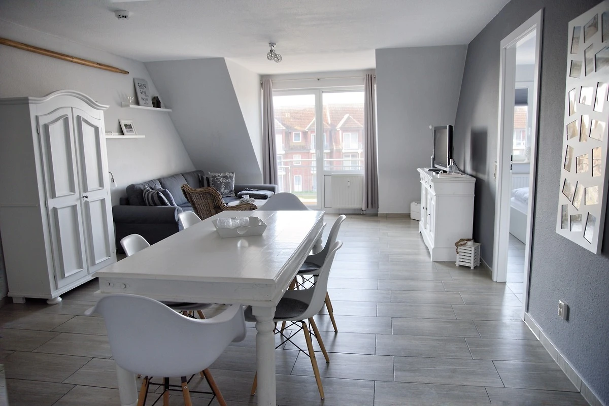 Das Wohnzimmer verfügt über einen grossen Esstisch mit sechs Stühlen, ein ausziehbares Klappsofa mit einem Schlafplatz für zwei Personen und einen Sessel. Multimedial steht Ihnen ein Flachbildfernseher zur Verfügung. Ihre Ferienwohnung hat einen Kabelanschluss. Auch einige Gesellschaftsspiele warten hier schon auf Sie.