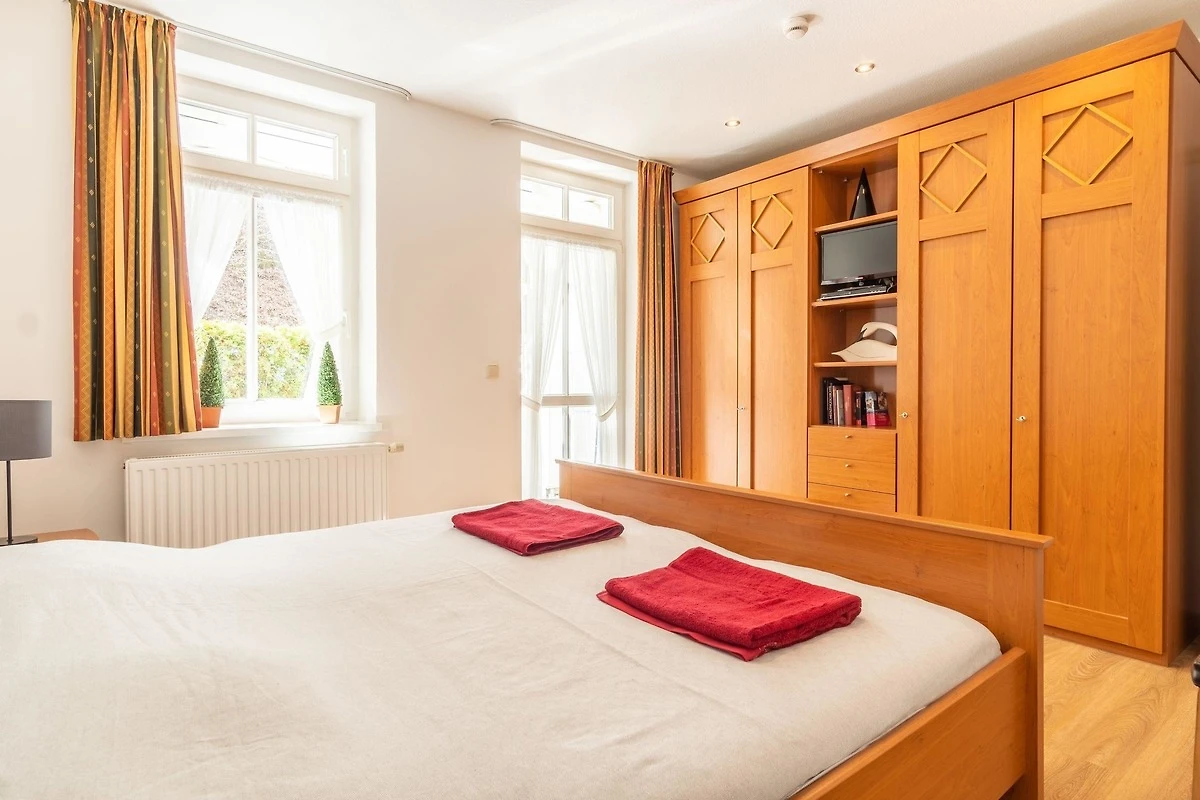 Im ersten Schlafzimmer befindet sich ein Doppelbett, ein grosser Kleiderschrank sowie ein zusätzliches Fernsehgerät. Von hier aus kommen Sie auf die kleine Terrasse.